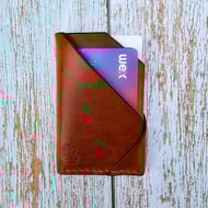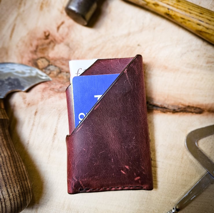 This card wallet features an abstract wrap-around design that is certain to make a statement. Crafted from beautiful burgundy pull up leather, which gains unique marks and colourations through use. This is a naturally soft leather, and feels lovely to hold. This wallet was completely hand crafted using my least piece of this leather, and was hand cut, stitched, and finished, with no machines being used in the process. It would make an ideal present for a loved one or as a gift for yourself! All wallets sold in my store are packaged in padded envelopes, which are both environmentally and letterbox friendly.