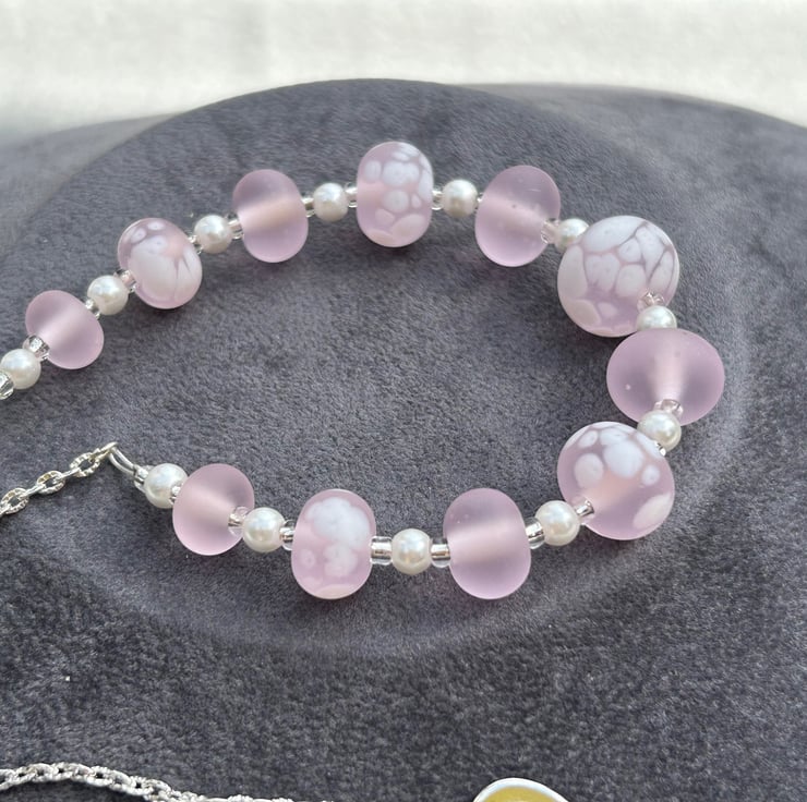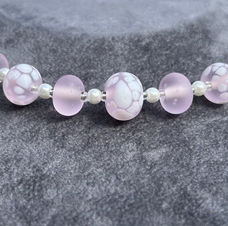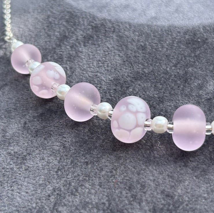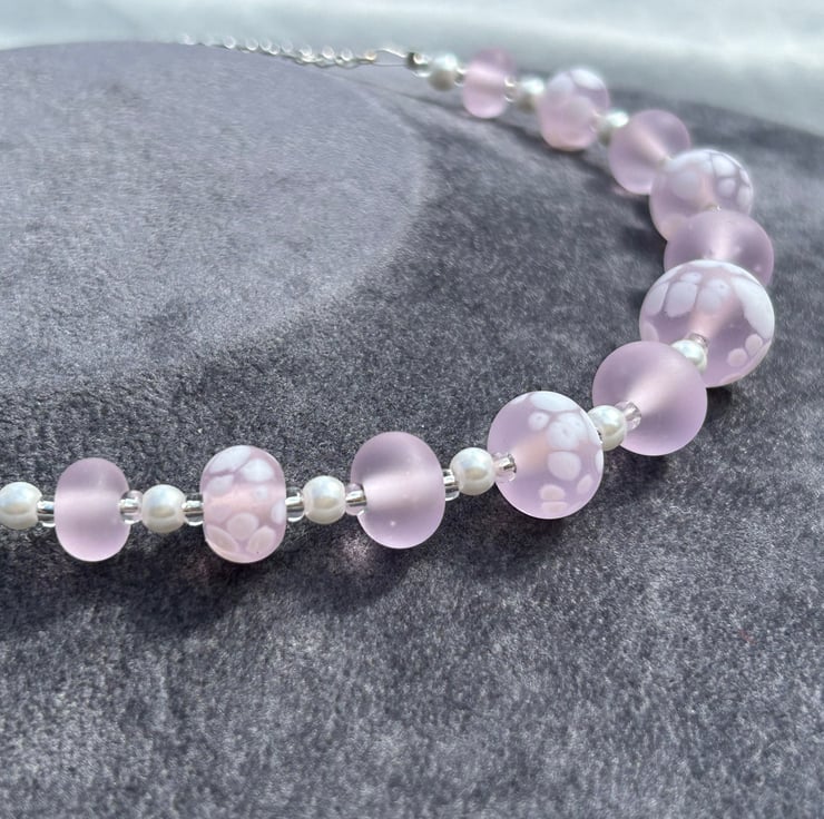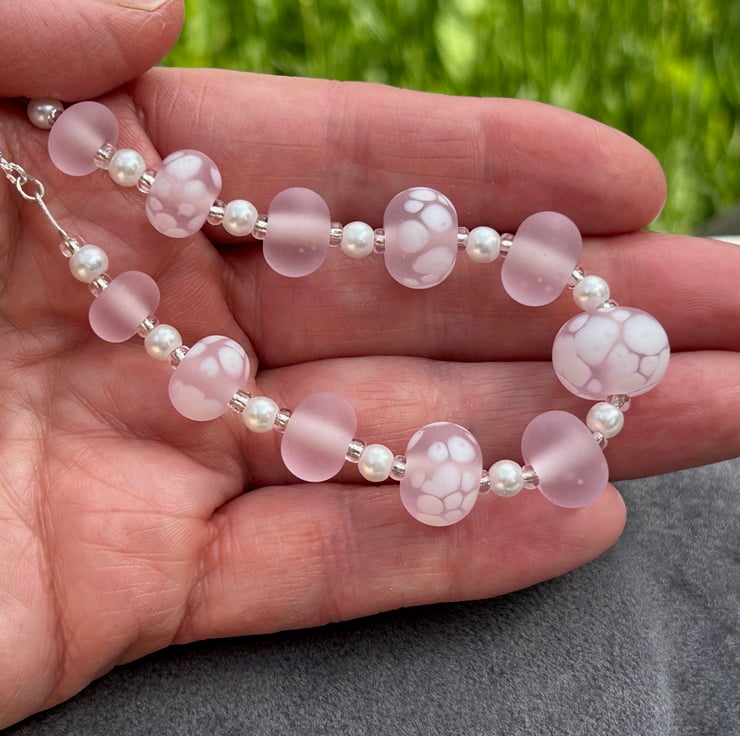 There are 11 of my own handmade lampwork glass beads in pale pink, 5 of which have small pieces of white glass melted onto the bead. Once the beads came out of the kiln and cleaned out, they were etched to give a velvety matt seaglass effect. The 5 spotted beads are 11-14mm in diameter, the plain pink ones are 9-12mm. I combined the beads when designing the necklace with clear silver lined seed beads and cream coloured glass pearls.