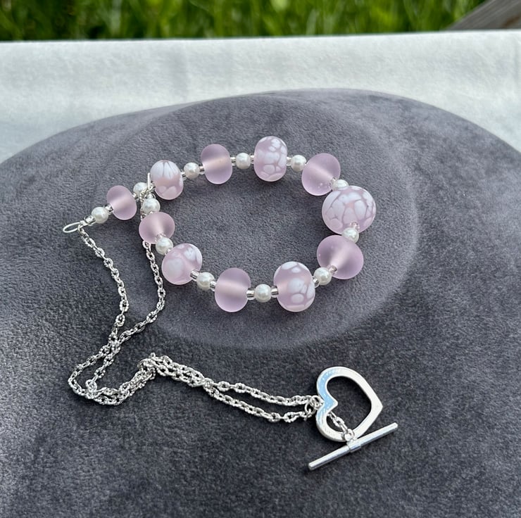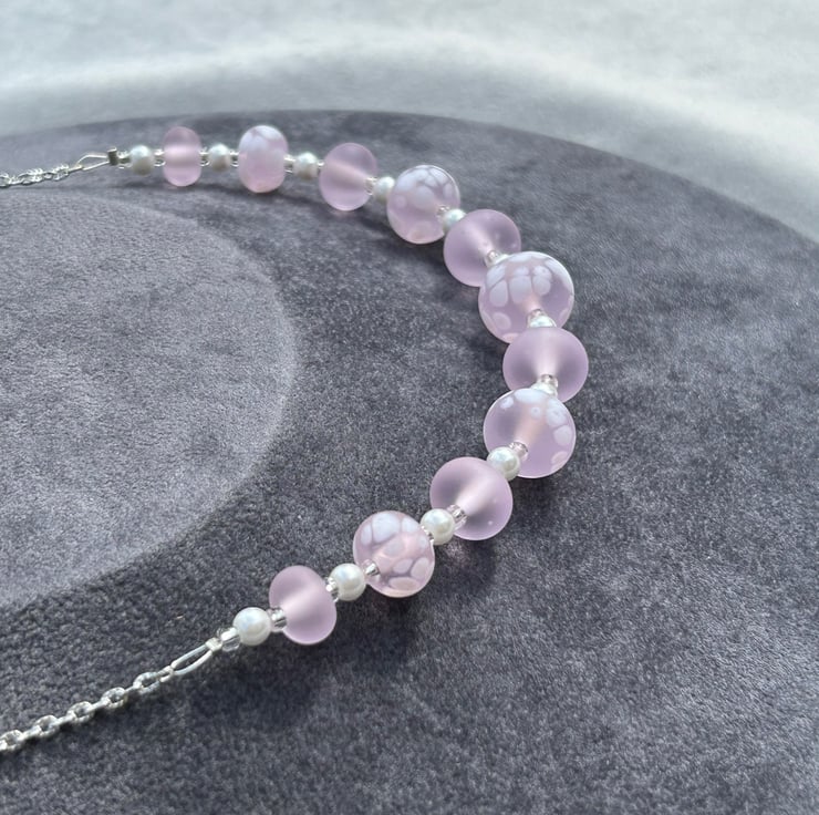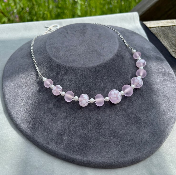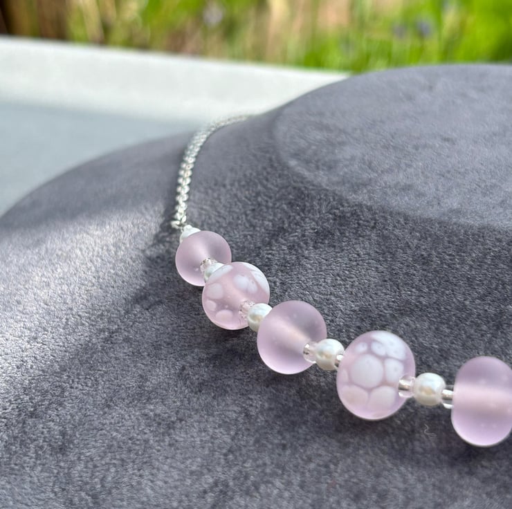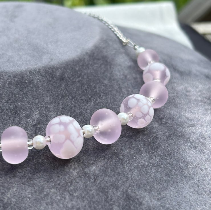 frosty pink and white spotted seaglass effect etched lampwork glass necklace