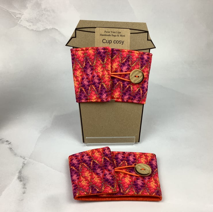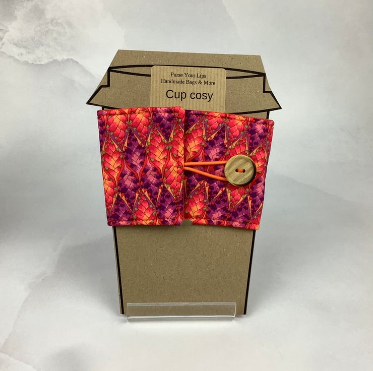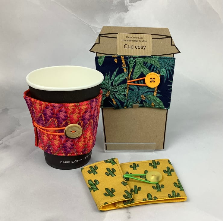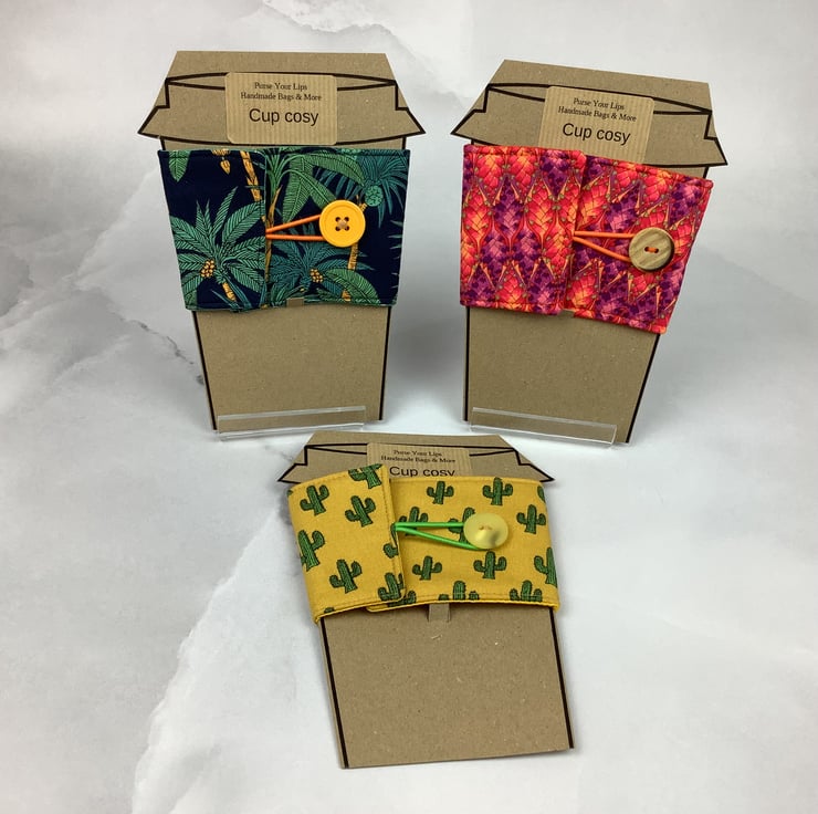 Each of my unique cup holders is individually made by me in my relaxing and tranquil little West Sussex garden studio so the pattern placement and button may vary.