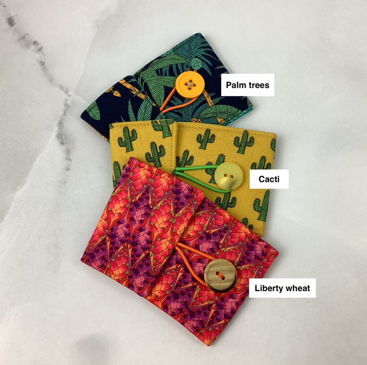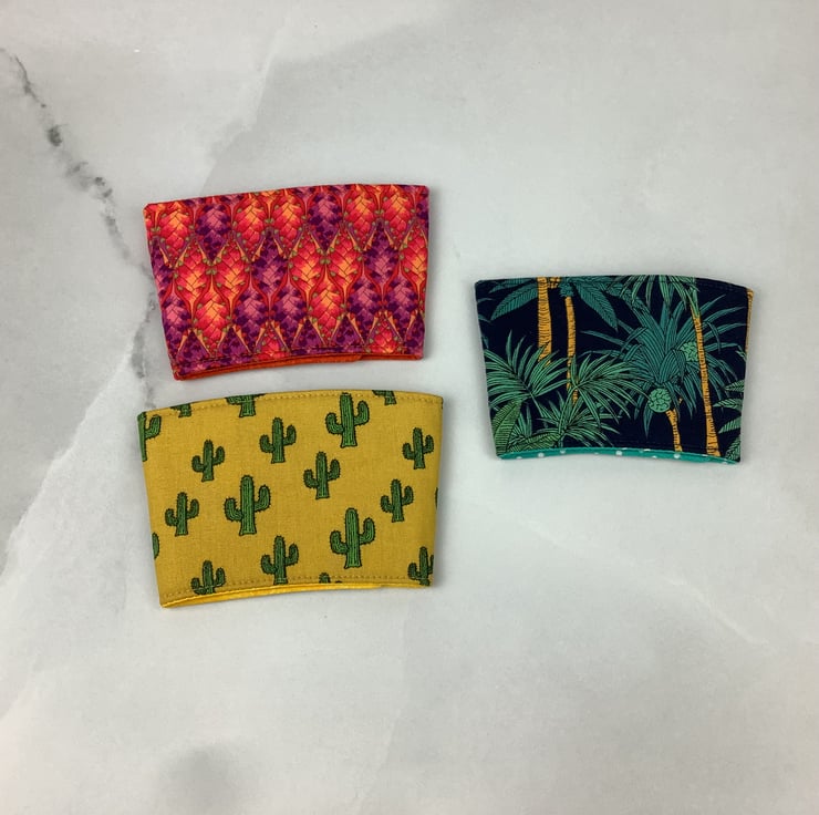 Handmade fabric cozy in a fun selection of plants inspired cotton fabrics and lined in complimentary cottons. The options are, palm trees, cacti or a striking wheat pattern.