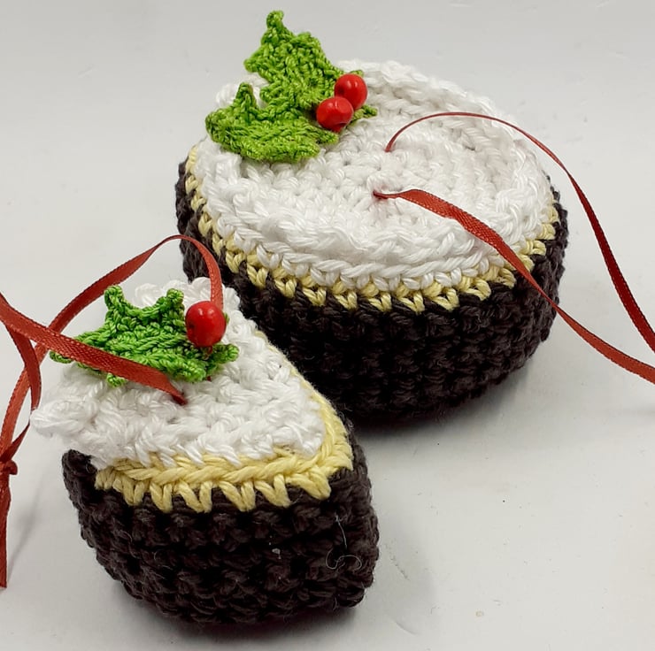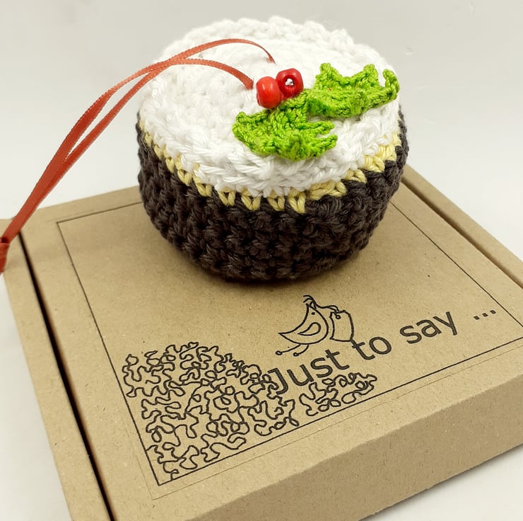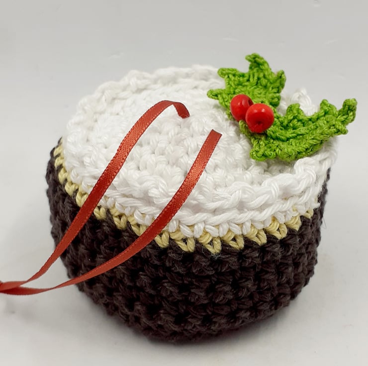 This tempting treat is crocheted in cotton and filled with polyester stuffing. The base is lined with a circle of felt. There are holly leaves made from a pattern based on one by Lucy at Attic24 and the berries are two tint painted wooden beads.