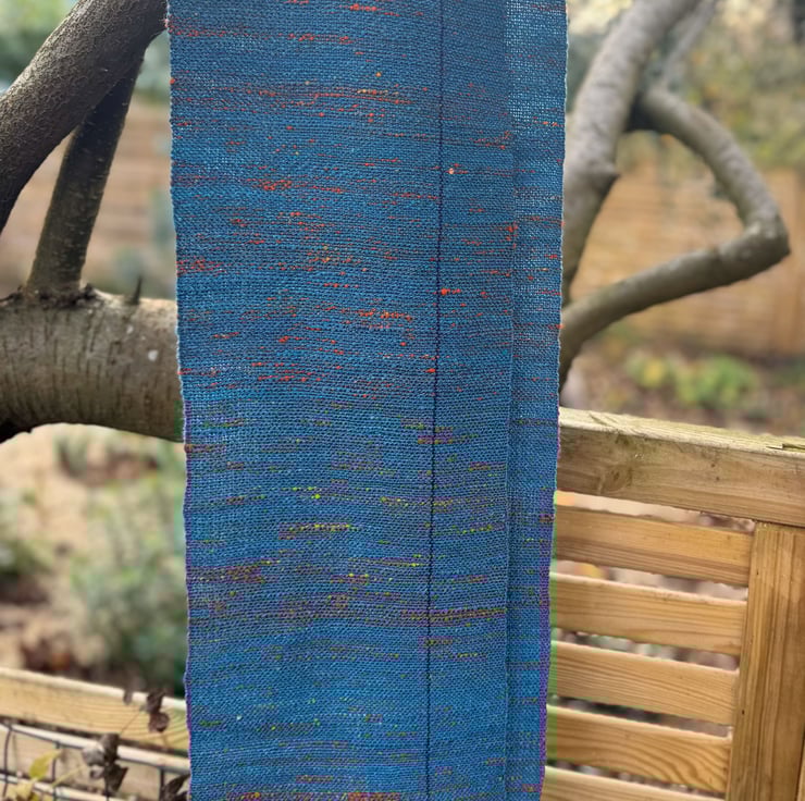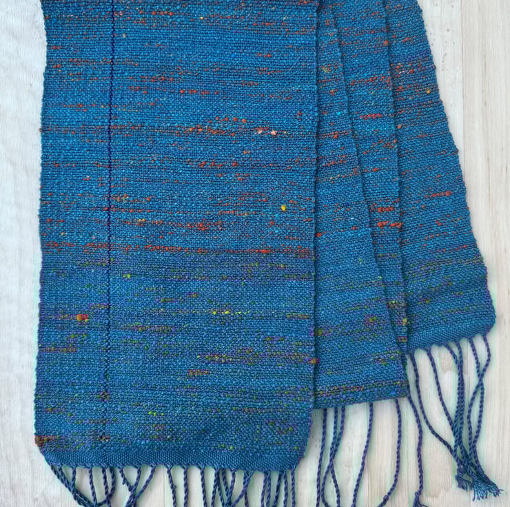 Reflecting the hues of a twilight sky at sunset, this light-weight scarf is hand-woven, using a weft of hand-spun yarn (comprised of 75% merino wool, 13% tussah silk and 12% recycled sari silk). The scarf is a deep grey-blue, with flecks of bright orange (and just the tiniest bit of yellow) like the clouds catching the very last of the sun as it sets. The warp is a matching grey-blue tencel (a cellulose fibre that feels similar to silk, but is more sustainable), with a solitary amethyst purple line to bring out the purples inherent in the blue. The scarf is 150cm long (excluding the tassels) and 20cm wide, an ideal size for wearing around the neck. Hand-wash carefully at low temperature and lie flat to air dry; the scarf can be ironed at low heat.