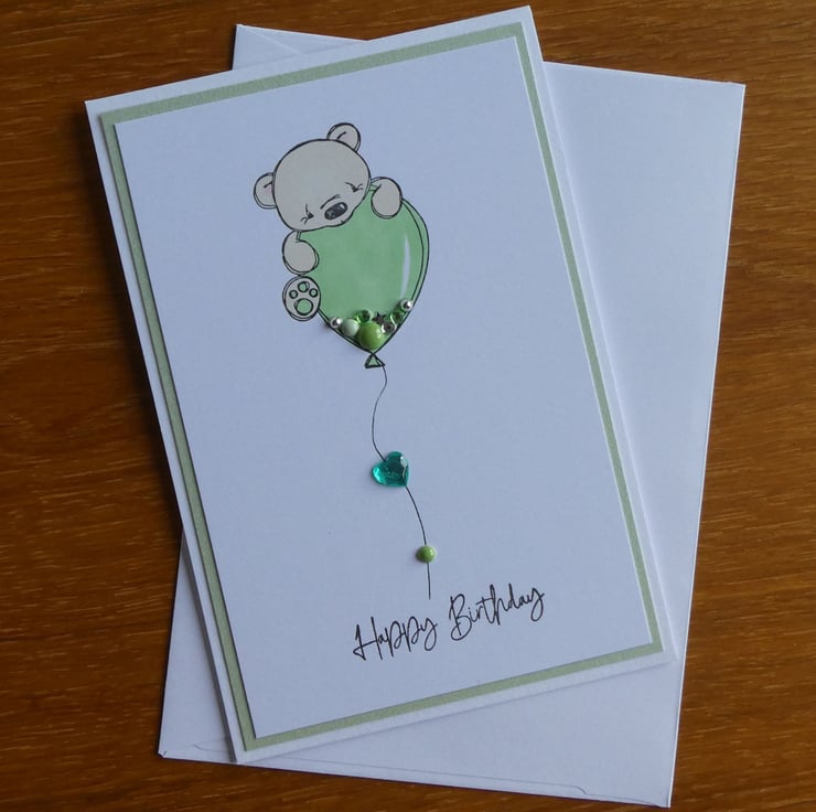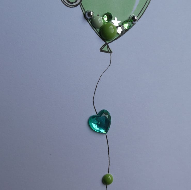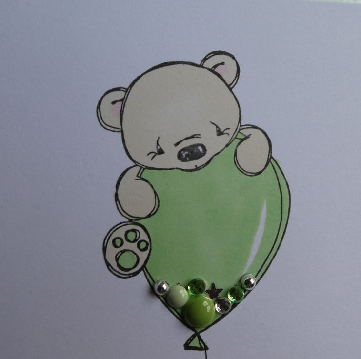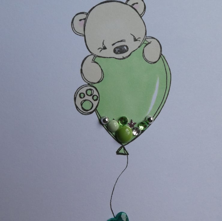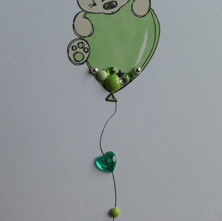 The image of a bear holding onto a balloon has been hand stamped and inked in soft beige and green. A selection of sequins, faux pearls and faux gemstones in shades of silver and green have been added at the bottom of the balloon and on it's trailing string.