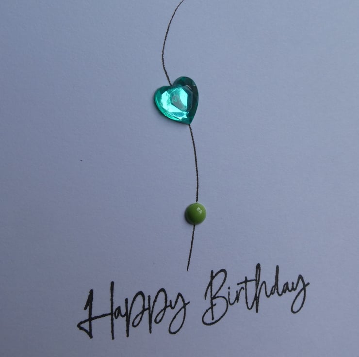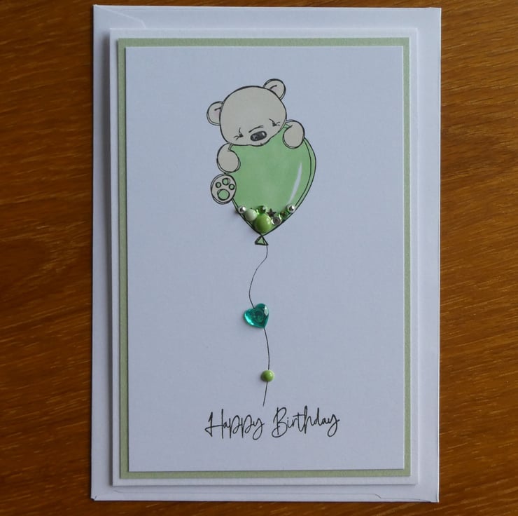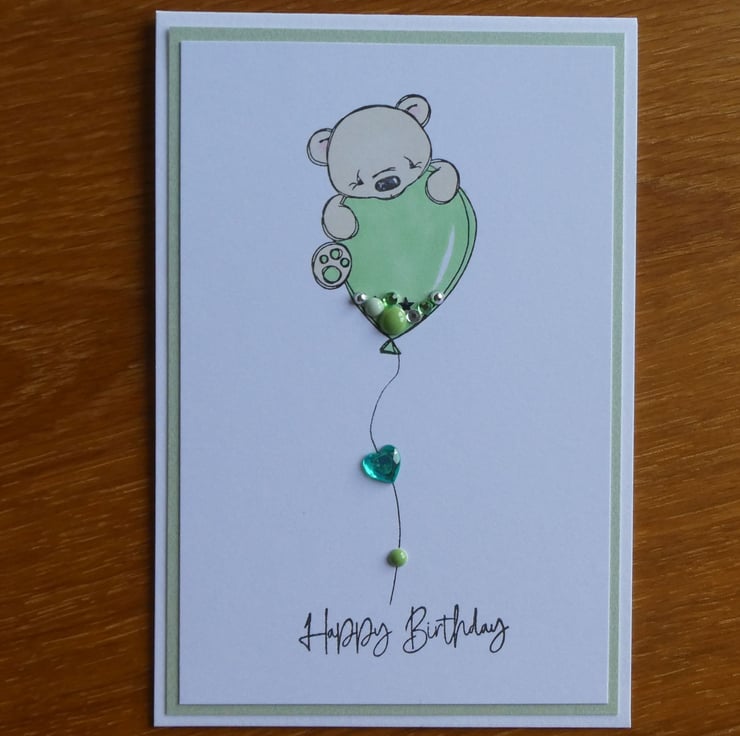 This birthday card has been hand stamped with a teddy bear holding onto a drifting balloon, coloured in soft pastel green and finished with a mixture of sequins and faux pearls.