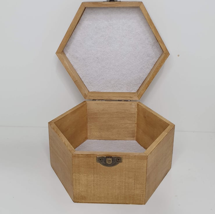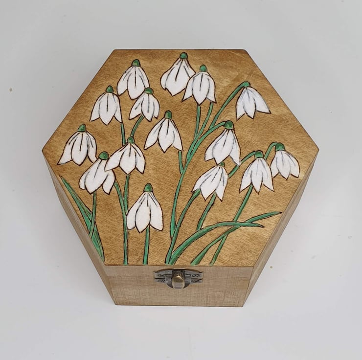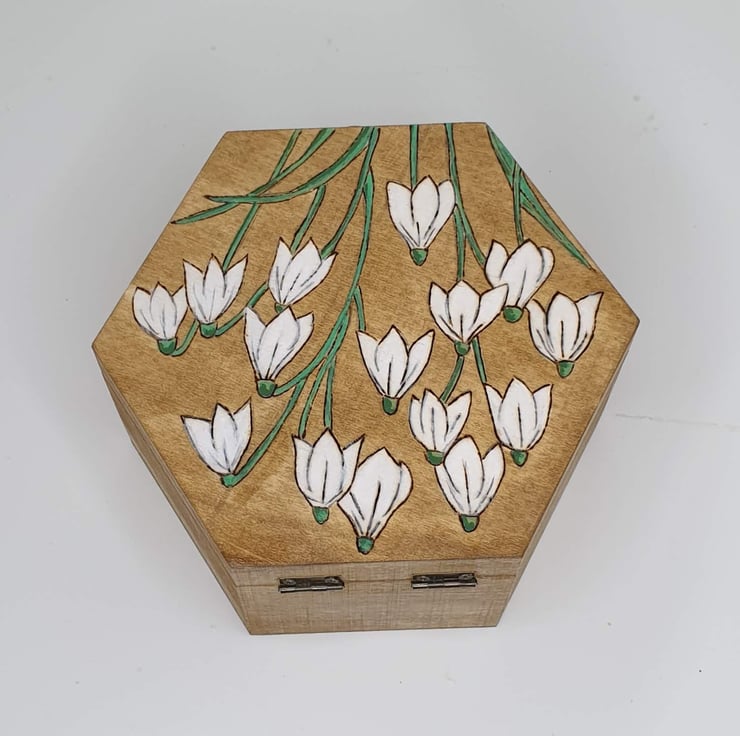 Snowdrops design hexagonal wooden box with a metal clasp which has been lovingly hand burnt using the art of pyrography. The lid features pretty snowdrops which have been woodburned and coloured with acrylic paints. The box has also been coloured with light oak stain and finished with varnish. The interior of this decorative box has been part-lined with white felt.