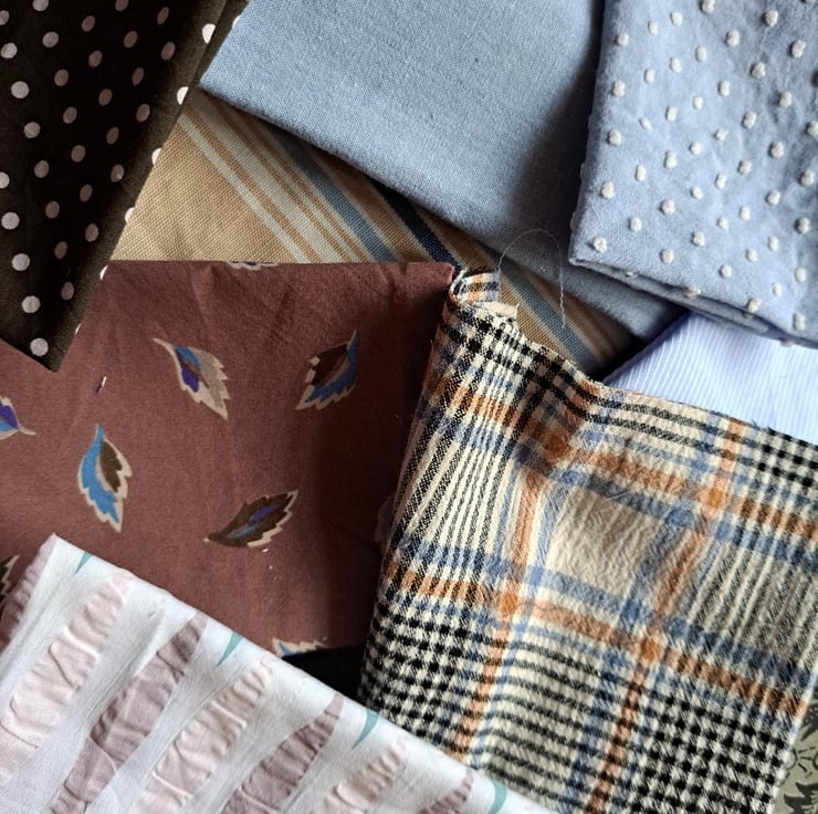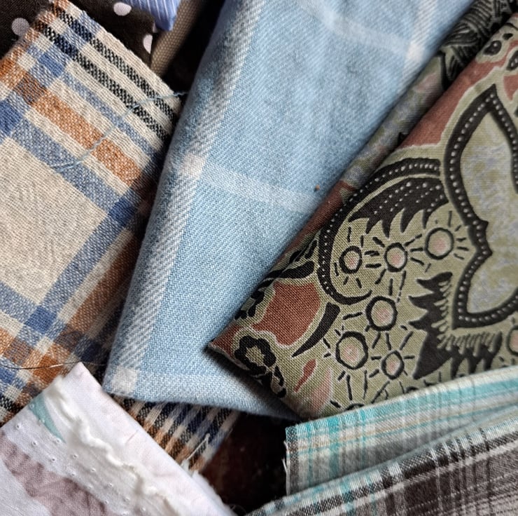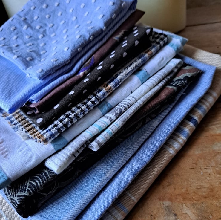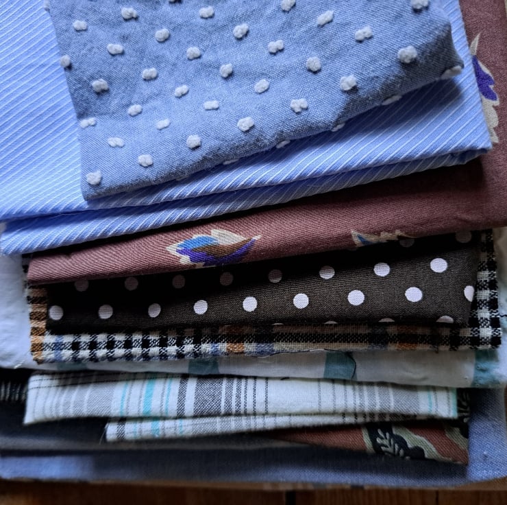 Powder blue looks so great against mid brown - such a visually comforting combination. This bundle contains 11 assorted vintage, rescued, repurposed and remnant cotton fabrics, including a 79cm by 46cm piece of cotton canvas. A deeply lovely combo.