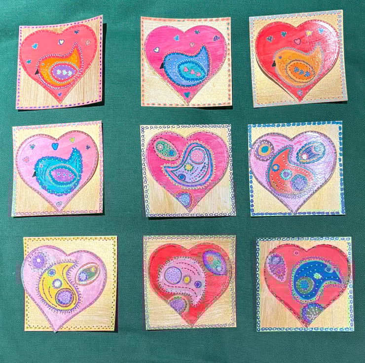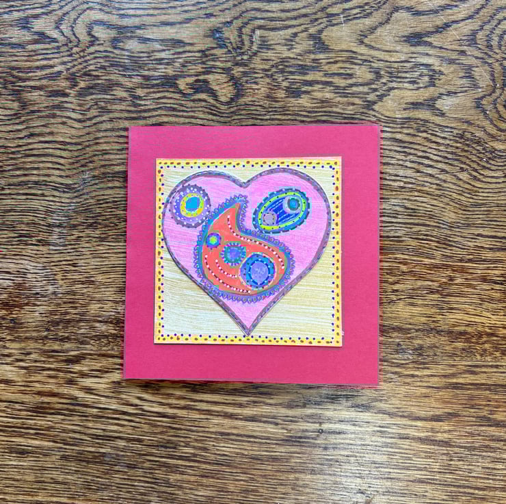 Made by hand piecing a hand painted paper heart motif and gold square motifs this card for someone you love will suit many occasions. The heart and square motifs have been hand painted by me and set against a red background.