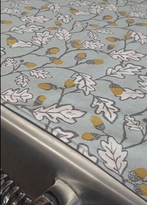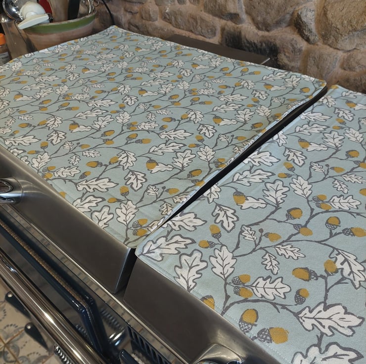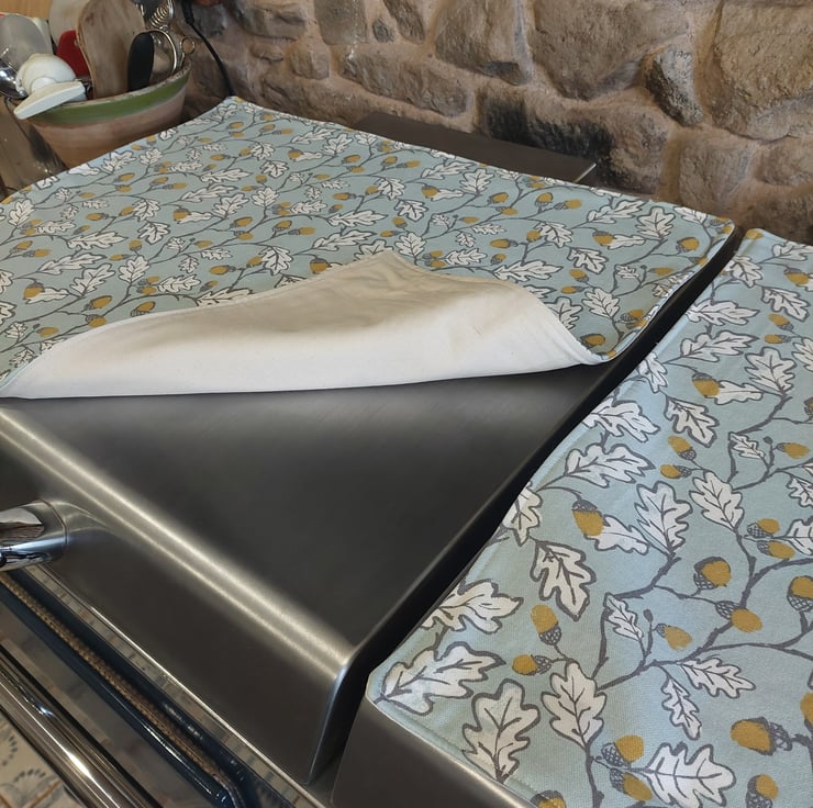Magnetic Everhot lid covers made from 100% cotton Acorn Duck Egg Blue fabric with a printed leaf and acorn pattern. Ideal for a country cottage core home style with its sketched leaf pattern in grey, white leaves, and mustard yellow acorns a plain background for a modern contemporary feel in your kitchen. Top stitched around the edge of the cover. Fabric comes in different background colours.