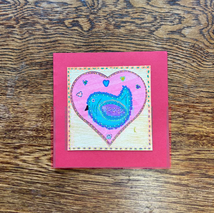 Made by hand piecing a hand painted paper heart motif and gold square motifs this card for someone you love will suit many occasions. The heart and square motifs have been hand painted by me and set against a red background.