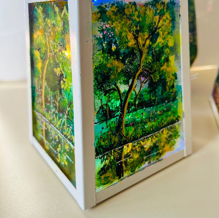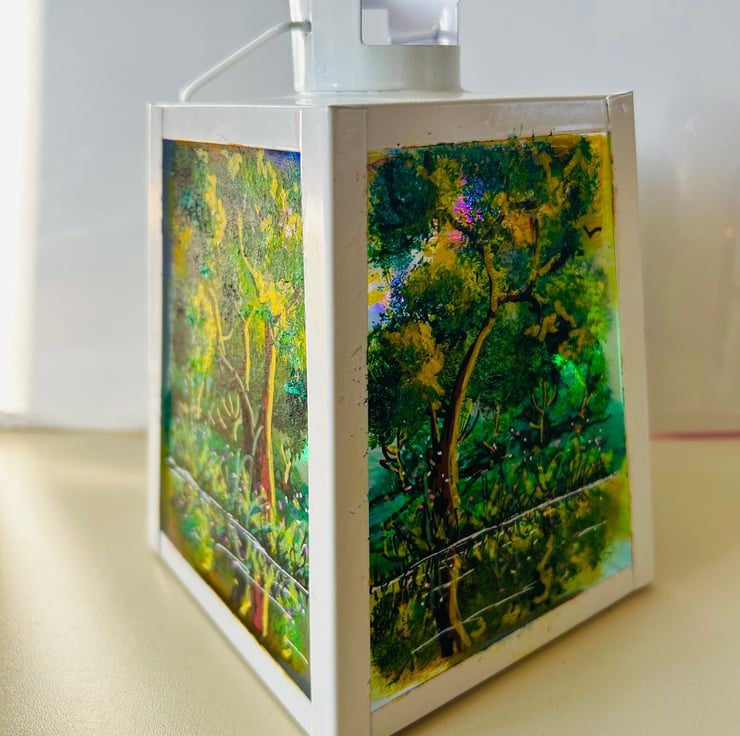 A hand painted and fired glass and metal lantern by Andrew Jenkins