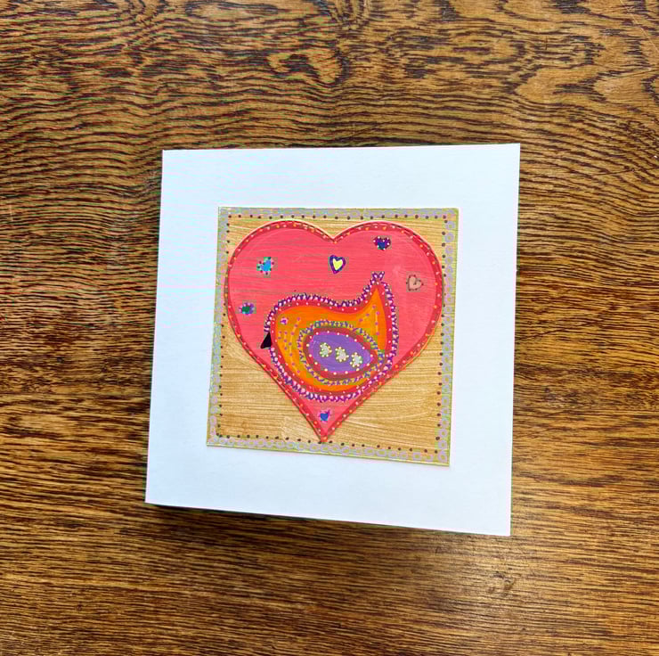 Made by hand piecing a hand painted paper heart motif and gold square motifs this card for someone you love will suit many occasions. The heart and square motifs have been hand painted by me and set against a white background.