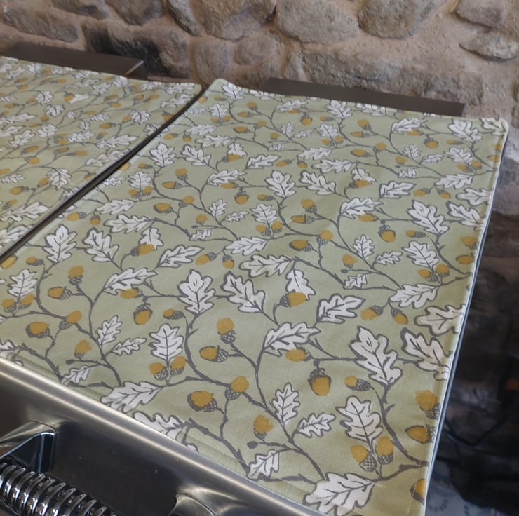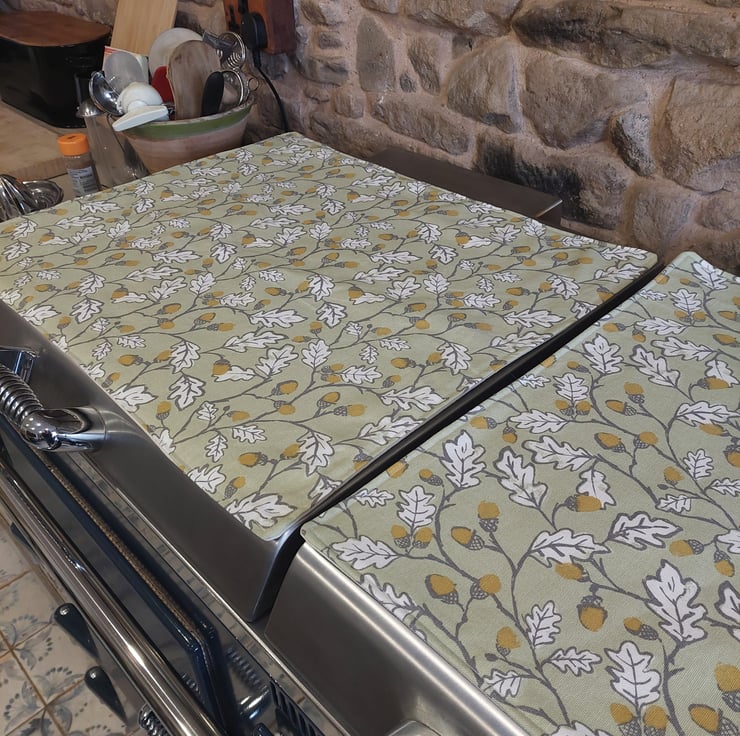 Magnetic Everhot lid covers made from 100% cotton Acorn Sage Green fabric with a printed leaf and acorn pattern. Ideal for a country cottage core home style with its sketched leaf pattern in grey, white leaves, and mustard yellow acorns a plain background for a modern contemporary feel in your kitchen. Top stitched around the edge of the cover. Fabric comes in different background colours.