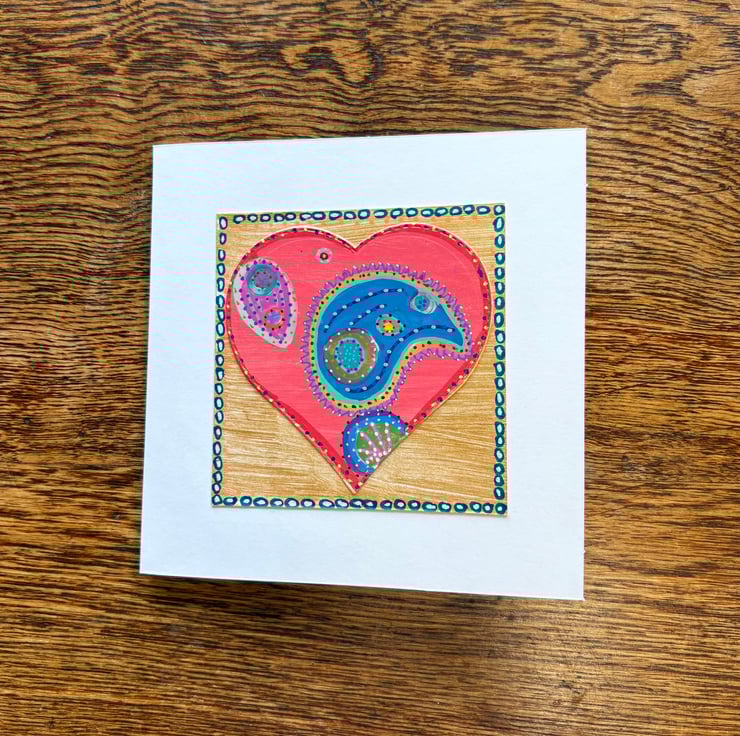 Made by hand piecing a hand painted paper heart motif and gold square motif this card for someone you love will suit many occasions. The heart and square motifs have been hand painted by me and set against a white background.