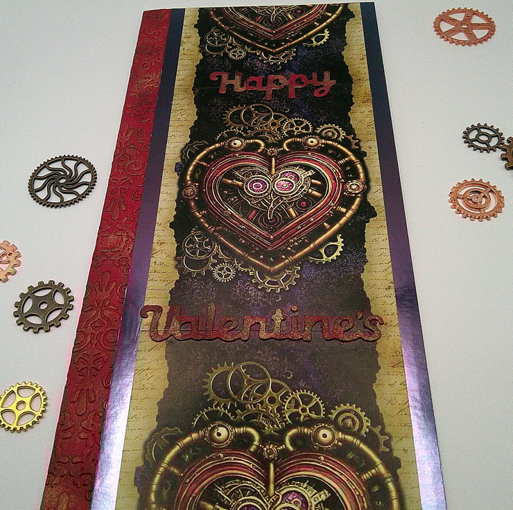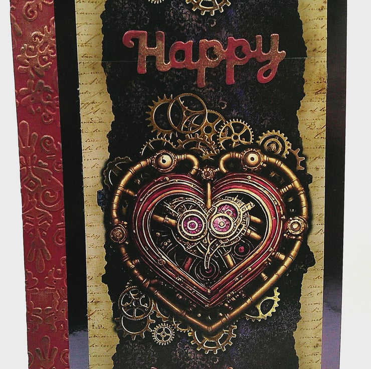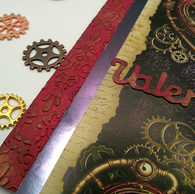 Slimline card made using a combination of die cut sentiments, embossed card stock, gold ink and steampunk style design paper, in a burgundy, copper, gold, navy and deep purple colour palette.