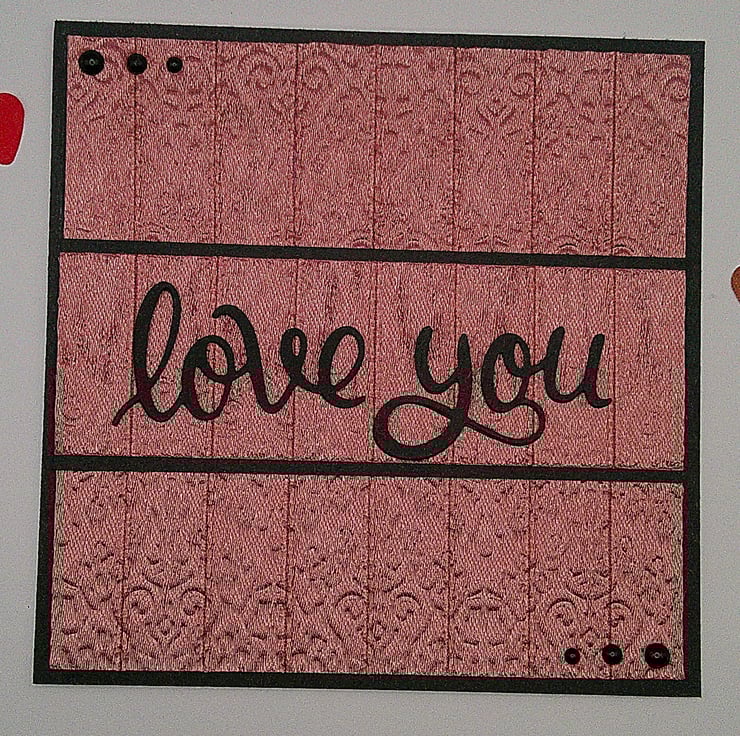 Measuring 5 x 5 inches (13 x 13 cm), this one off make has been created using embossed ribbon in a rose gold colour, paired with a contrasting matt black card and half round black dot embellishments. The raised 3D sentiment on the front of the card reads ‘Love You’, and the internal stamped sentiment reads ‘together is a beautiful place to be’. This makes it an ideal card for an anniversary, valentine’s day, wedding day or just to remind that special someone, how much they meant to you.