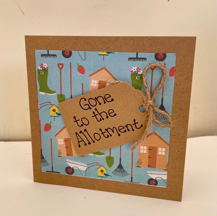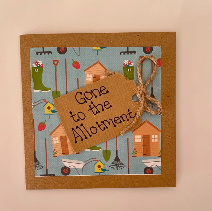 Gone to the allotment. Individually handmade card. Perfect for a gardener. Suitable for any occasion.