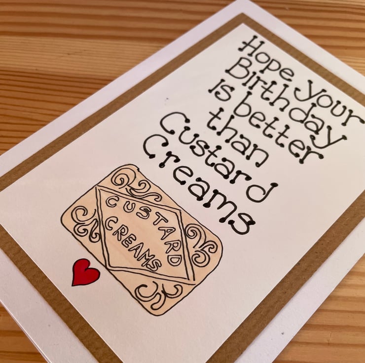 The handwritten message reads "Hope your Birthday is better than Custard creams"