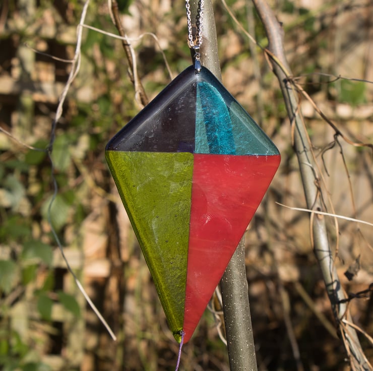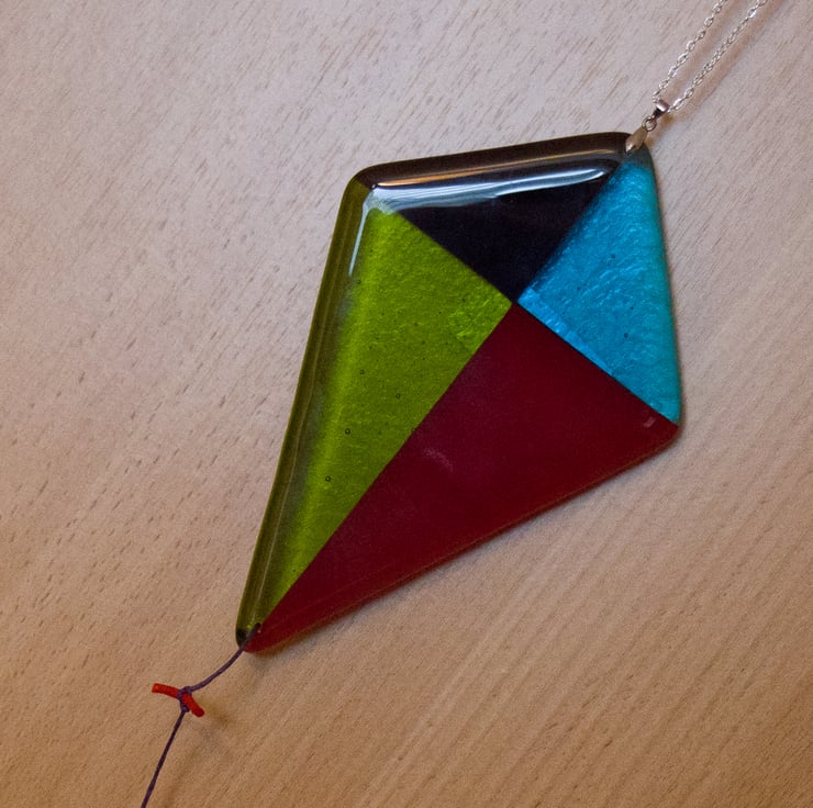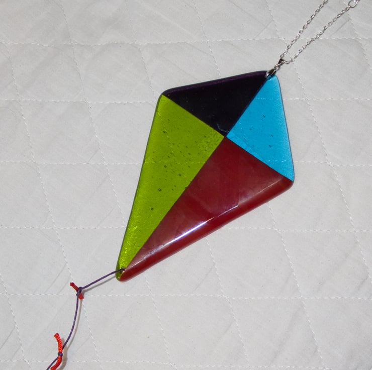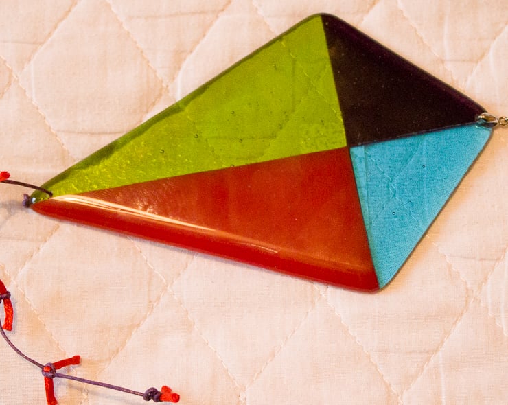 This kite is made of 4 coloured segments - one each of Purple, Blue, Red, and Green. It is approximately 16 cm tall and 10cm wide and has a leather thong for a tail. It will hang from a stainless steel chain.