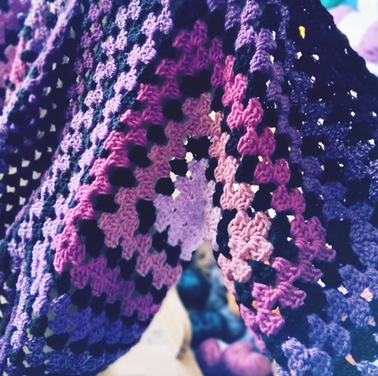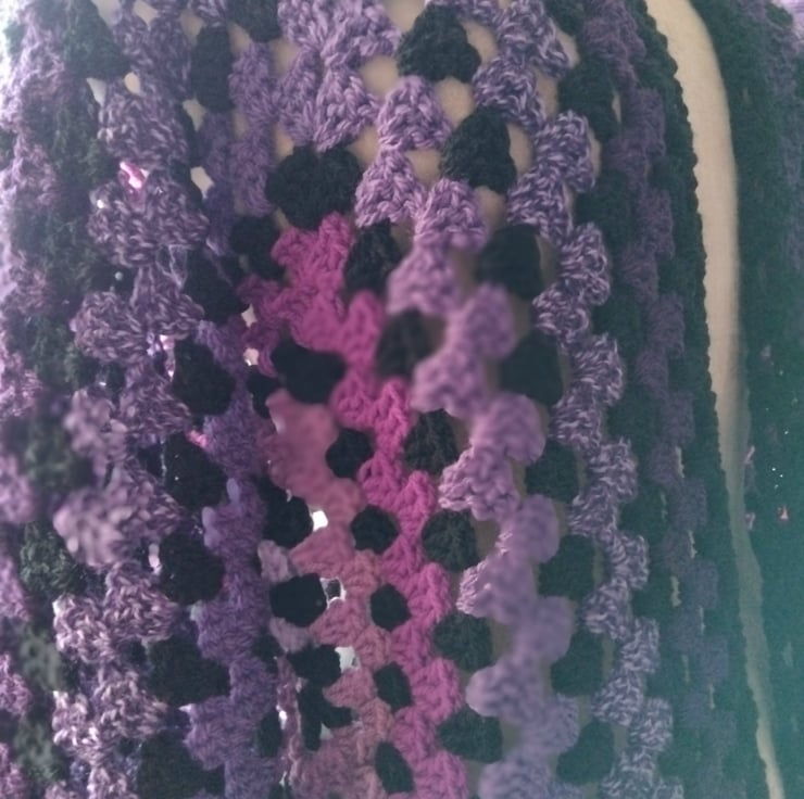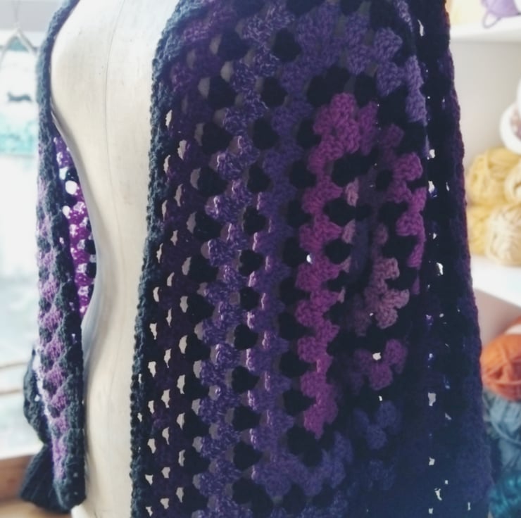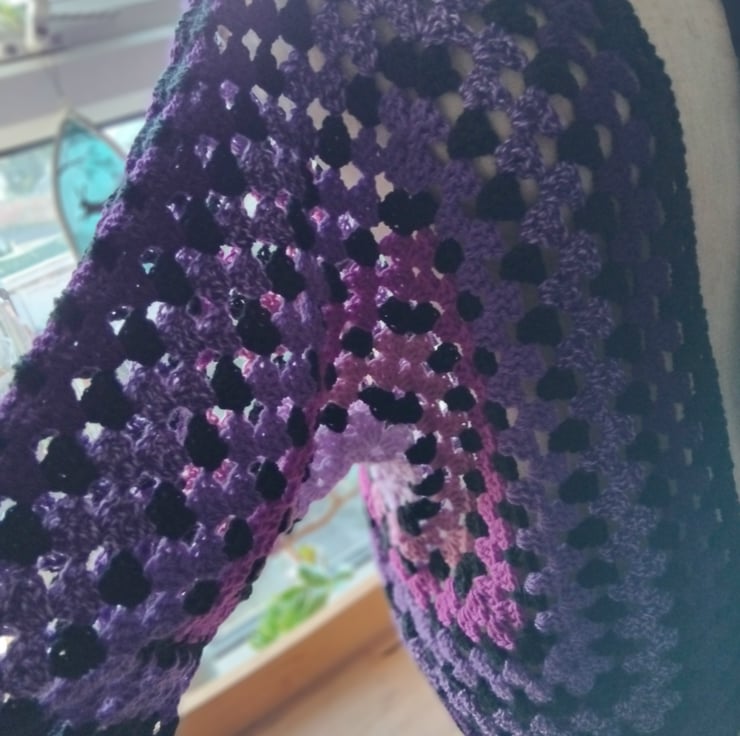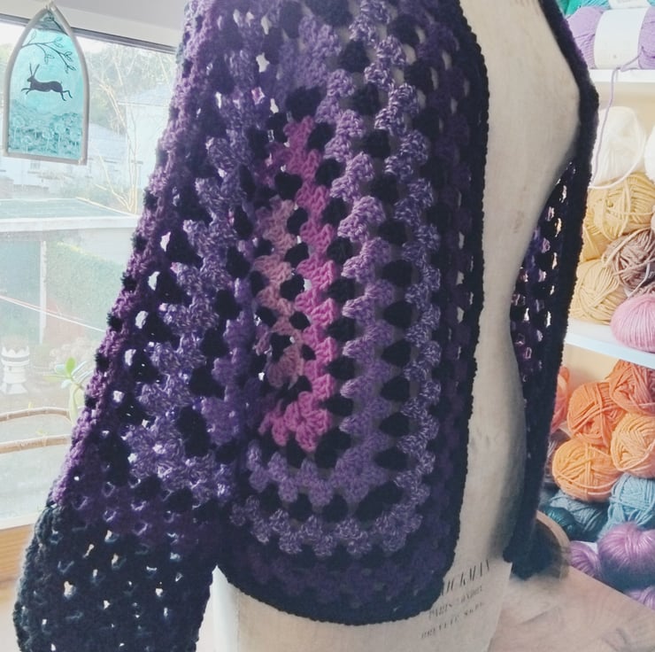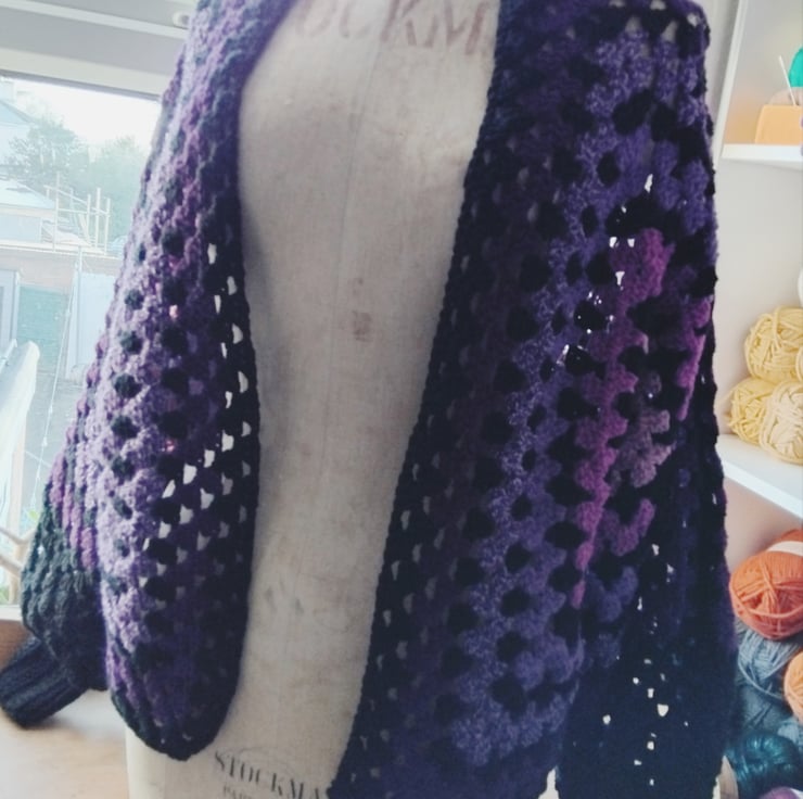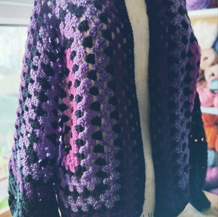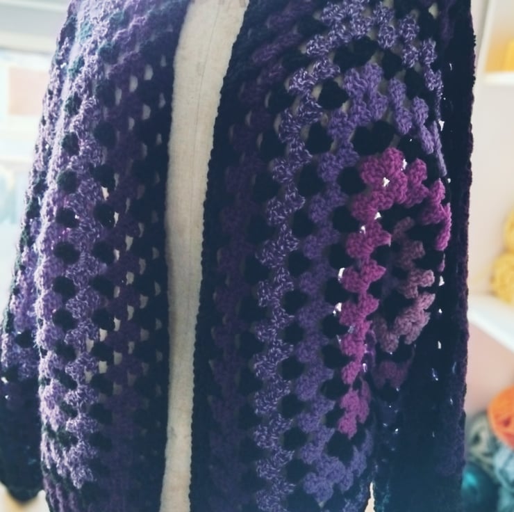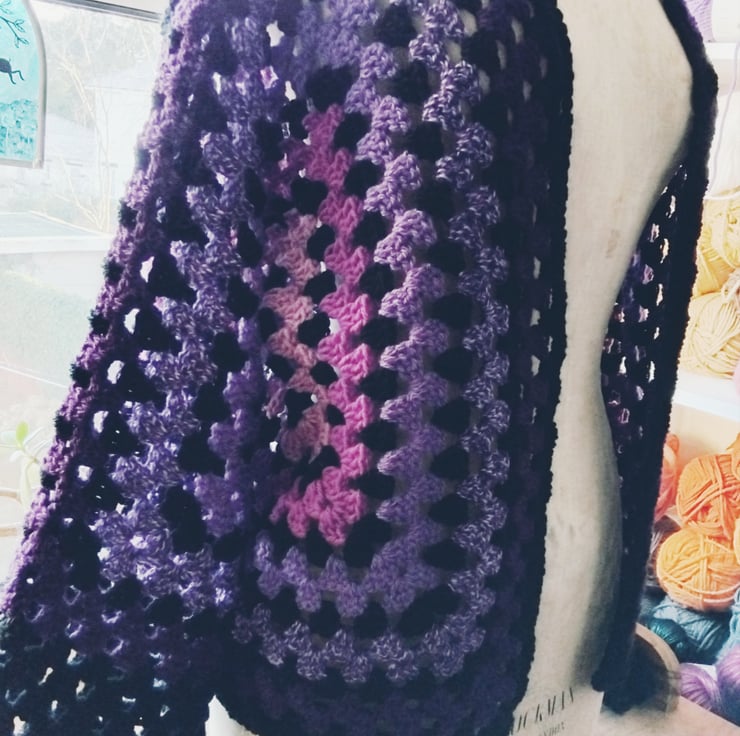 Crochet hexagon cardigan in a vibrant rainbow of purples.