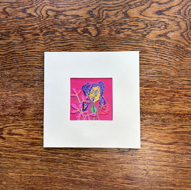 Made by hand piecing hand painted paper flower cutouts this versatile card will suit many occasions. Each flower has been hand painted by me, arranged into a posy and set against a vibrant background.