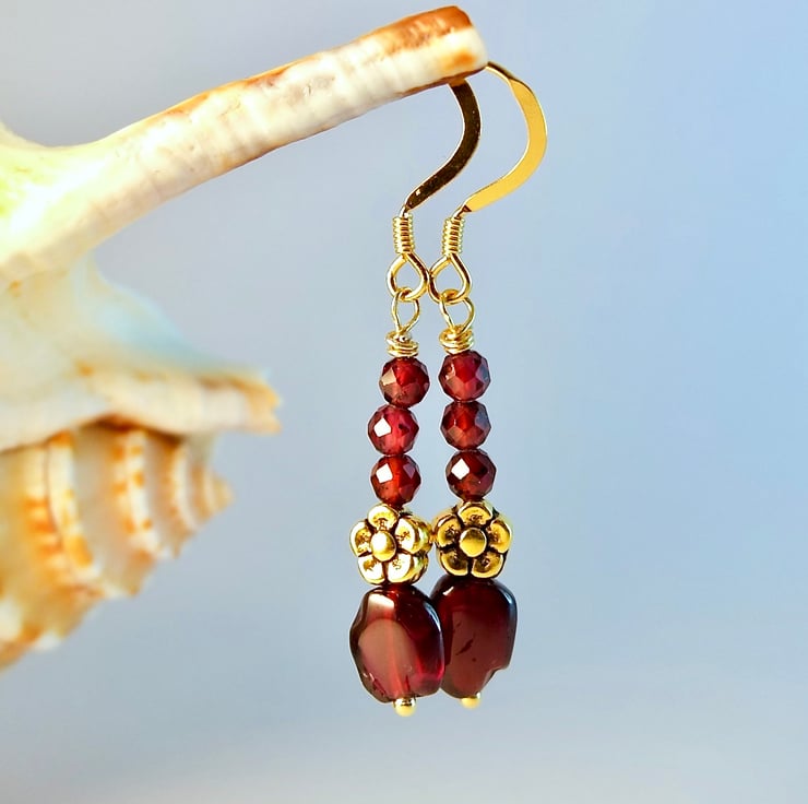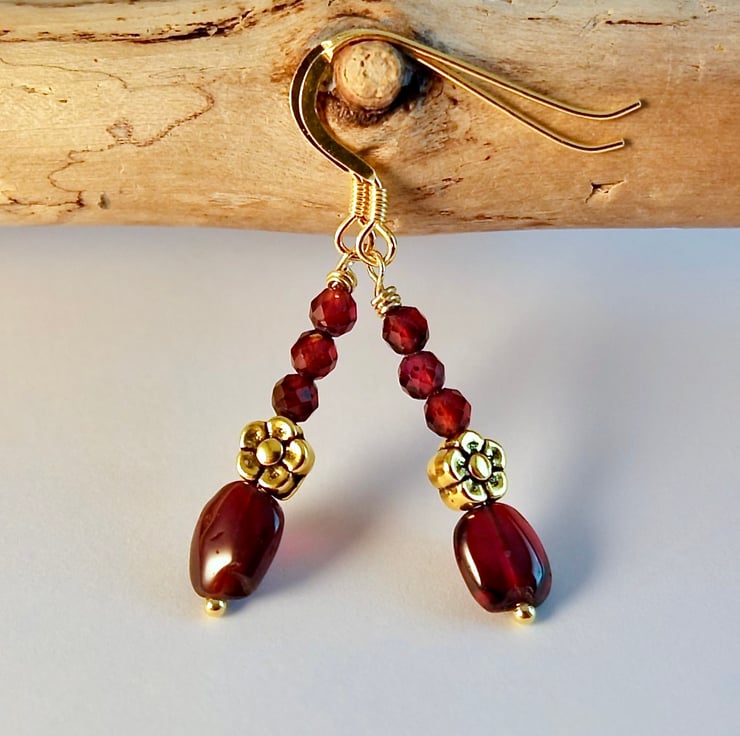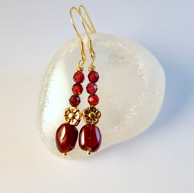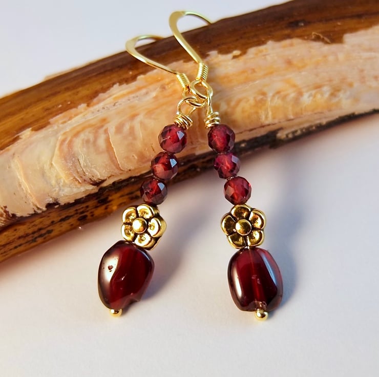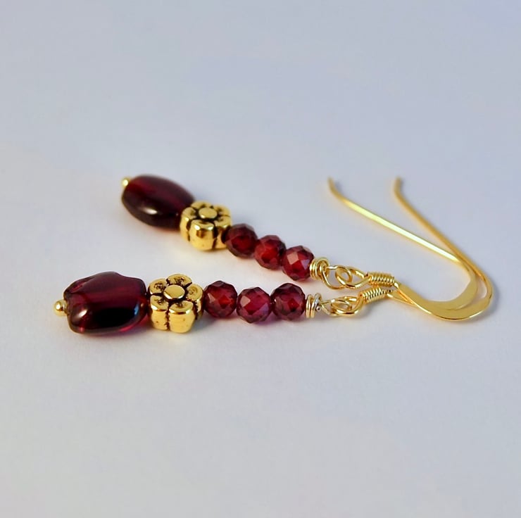 Each drop earring features a 8x6mm Garnet oval topped with a 5mm Tibetan style antique gold flower bead and a trio of 3mm, AAA grade, faceted Rhodolite Garnet beads.