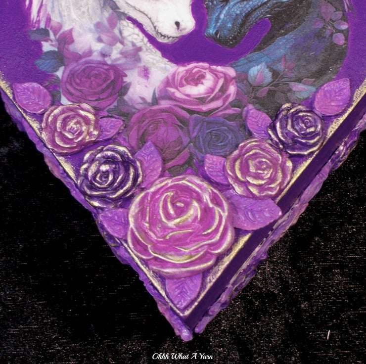 The lid is decorated with two gorgeous decoupage dragons with roses. I have added 3D airdry clay roses to the lid which I have then painted with acrylic paints and highlighted with gold wax paste. I have also added a painted rose and leaf border around the outside of the box.