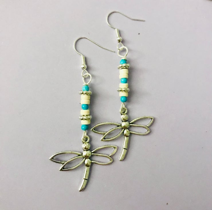 Beautiful boho earrings featuring dragonfly charms. Tarnish resistant silver plate jewellery wire.