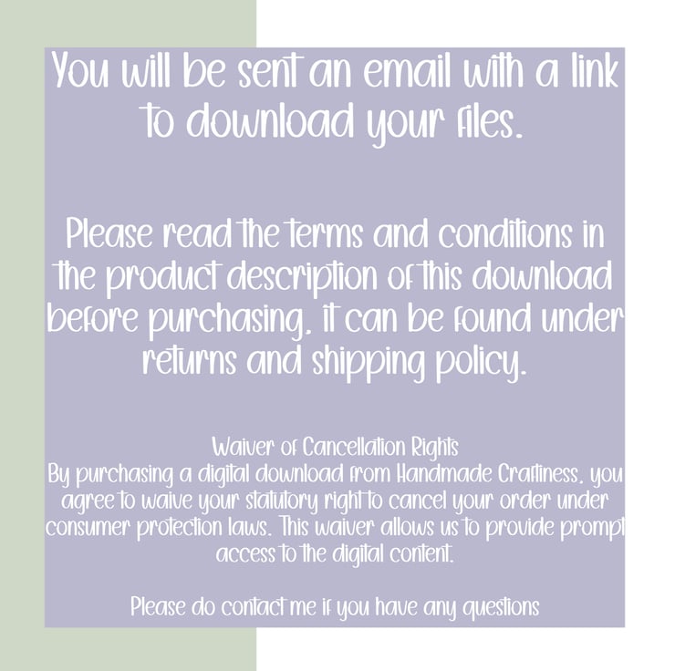 Refund Policy for Digital Downloads Acceptance of Terms By completing your purchase, you acknowledge and accept this refund policy. At Handmade Craftiness, we are committed to providing high-quality digital products. Please read our refund policy carefully before making a purchase: Waiver of Cancellation Rights By purchasing a digital download from Handmade Craftiness, you agree to waive your statutory right to cancel your order under consumer protection laws. This waiver allows us to provide prompt access to the digital content. No Refunds After Download For digital downloads, consumers are required to waive their cancellation rights before the digital content can be provided. This means that once a customer (i.e., the consumer) has downloaded the content, they have given up their consumer rights to a refund. This policy aligns with consumer law for digital goods, ensuring the protection of intellectual property and preventing unauthorized distribution. Cancelling a Digital Download Under the Consumer Contracts Regulations 2013, digital downloads are neither goods nor services, meaning the law is a little different. If you want to download something within 14 days of buying it (known as the 'cooling-off’ period), you must give your consent to waive the 14-day cooling-off period. If you do not give your consent, the 14-day cooling-off period still applies. However, you will not be able to download your digital content until this period has ended. This policy exists to prevent customers from changing their minds after downloading the content. As you are being sent a link via email to download after purchase this will count as downloading the content as you will have access to download the files from the email. Eligibility for Refunds Refunds may only be issued under exceptional circumstances, such as: The digital content is proven to be defective or incomplete. An error on our part (e.g., duplicate billing). Contact Us If you believe you are eligible for a refund due to one of the exceptional circumstances above, please contact us at orders@handmadecraftiness.co.uk with your order details, a description of the issue, and proof of purchase. Our team will review your request and respond within 7 business days. For further inquiries, please contact us at orders@handmadecraftiness.co.uk. ------------------------------------------------------------------------------------------------------------------------------------------------------------- Ownership and Usage: All artwork within this shop is the exclusive property of Handmadecraftiness. You are expressly prohibited from reproducing, altering, redistributing, reselling, or claiming ownership of any digital item from this store. However, you are permitted to incorporate products from this store into your own physical handmade items for sale as a hobbyist. TERMS OF USE 1. You may print and use these items in a tangible journal/scrapbook/craft project etc. 2. You MAY NOT sell or share these files. 3. You MAY NOT reproduce/altar/redistribute our designs as a digital or physical item. 4. You MAY NOT sell or manipulate these files for resale purposes. 5. You MAY NOT share these files individually or as kits.