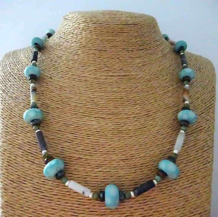 A necklace made with pale green lampwork glass beads, brown Czech glass beads and amazonite gemstone beads.