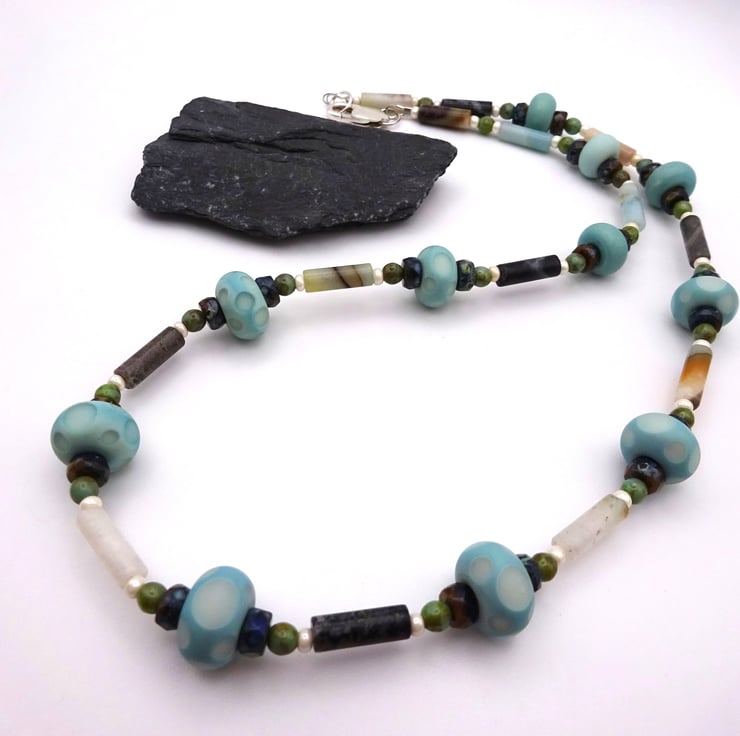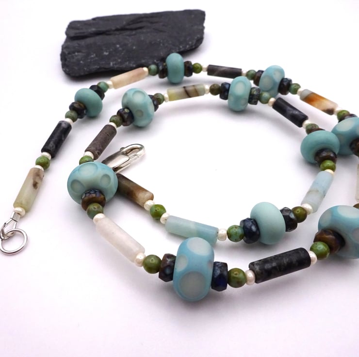 amazonite gemstone necklace, pale green lampwork glass jewellery