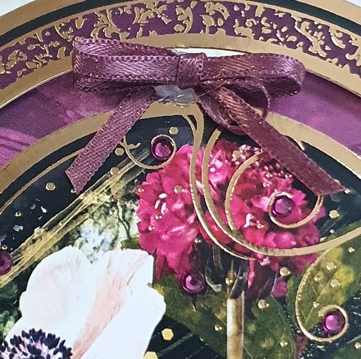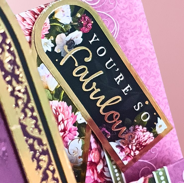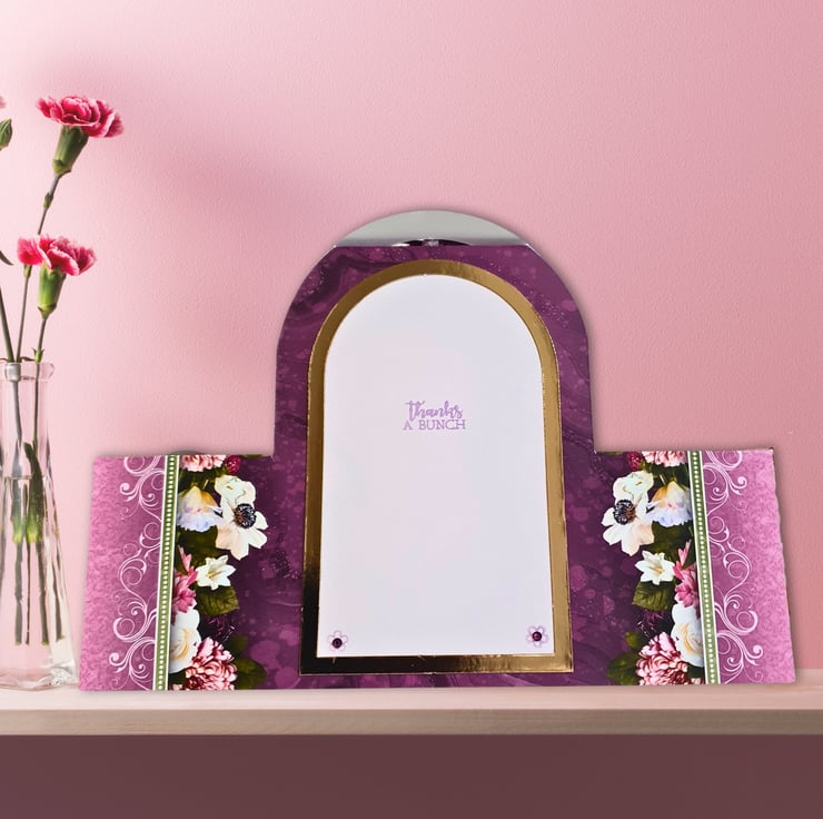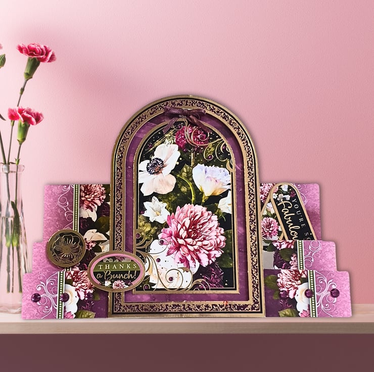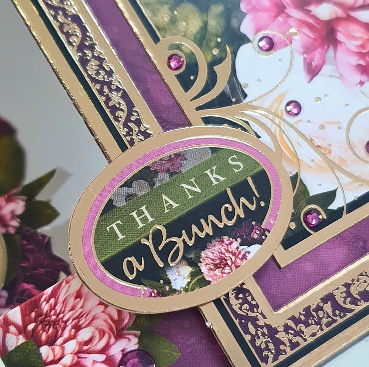It consists of one sheet of luxury card in plum purple shades, printed with floral edges, and turned into a three stepper shaped card. In the middle, the main arch topper displays a close up picture of colourful flowers, surrounded with a matching, gold foiled frame. The sentiment "Thanks A Bunch" lays on the bottom left corner of the main topper, while a tag that reads "You're So Fabulous" decorates the highest step. The card is finished with coloured diamante & a matching ribbon bow. The coordinating insert at the back is stamped with the sentiment "Thanks A Bunch", in a gold foiled arch frame.