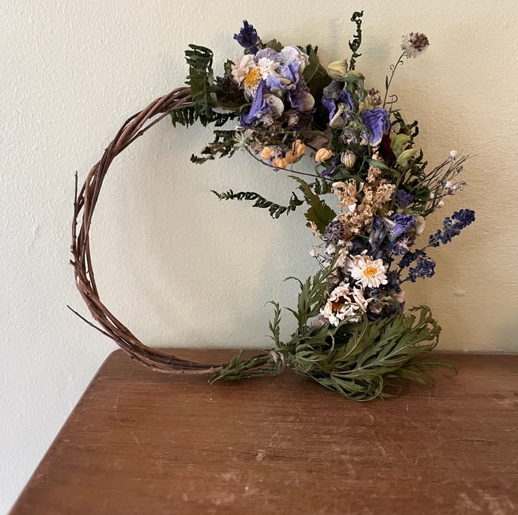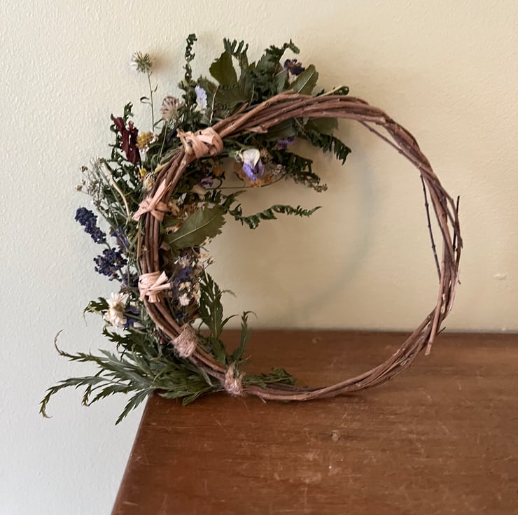 A handmade dried flower wreath decoration measuring approximately 13cm at it’s widest points.