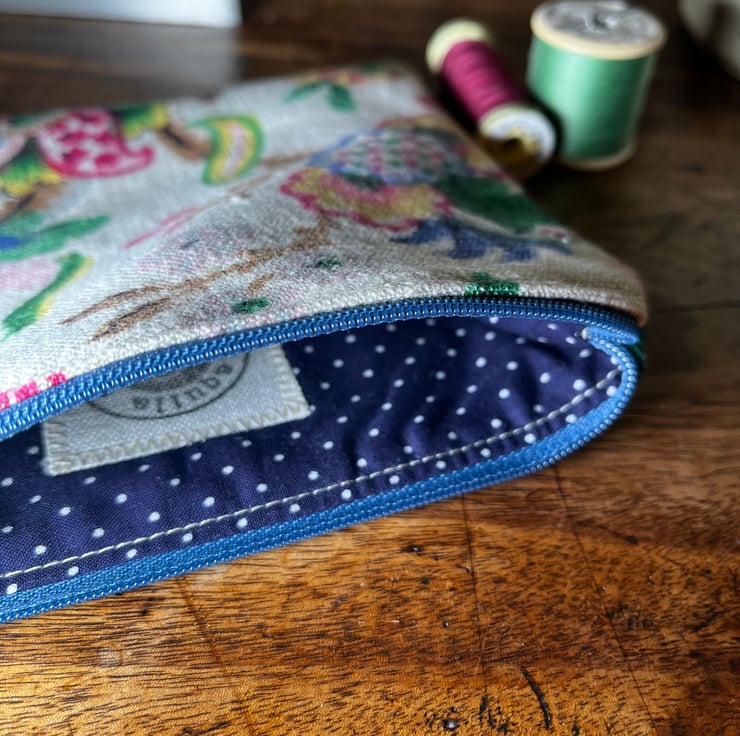 A strip of leather is tied to the zip pull. This can be swapped for ribbon if preferred. The zip is a coordinating blue.