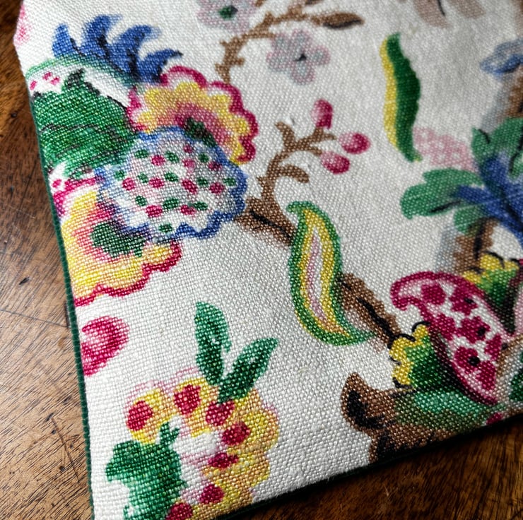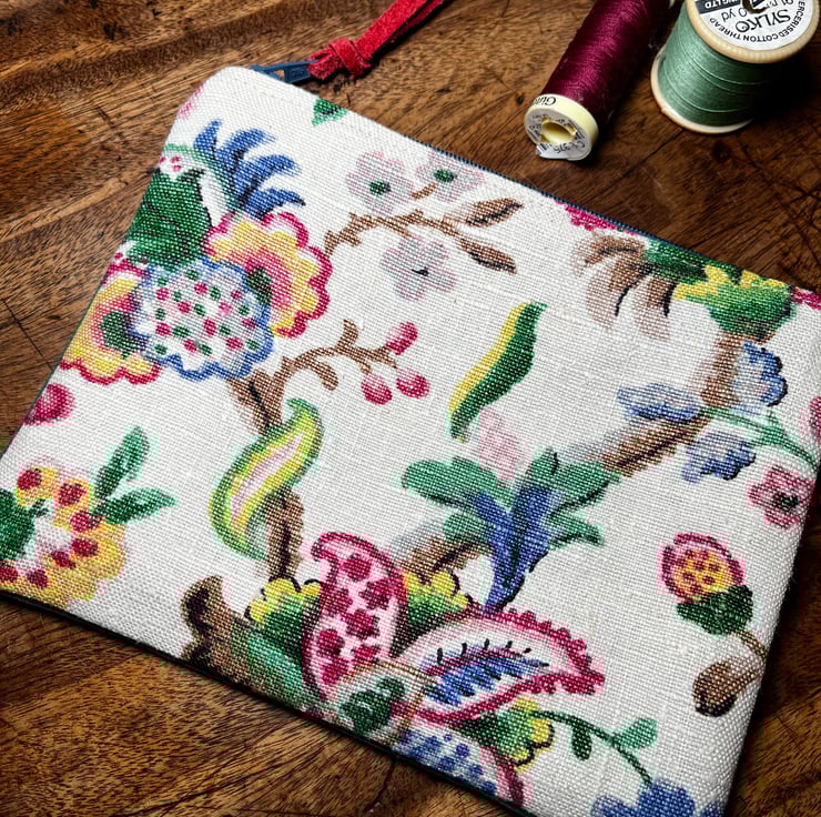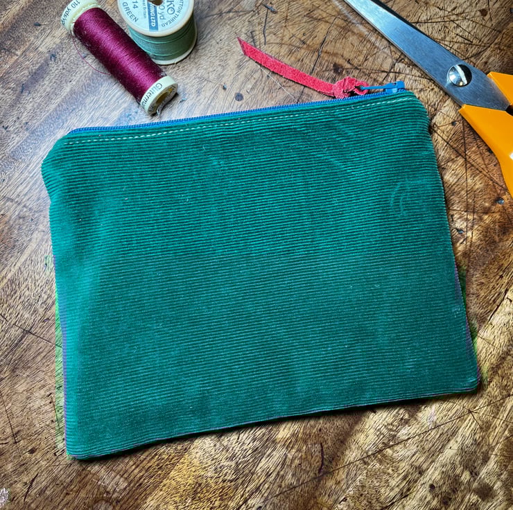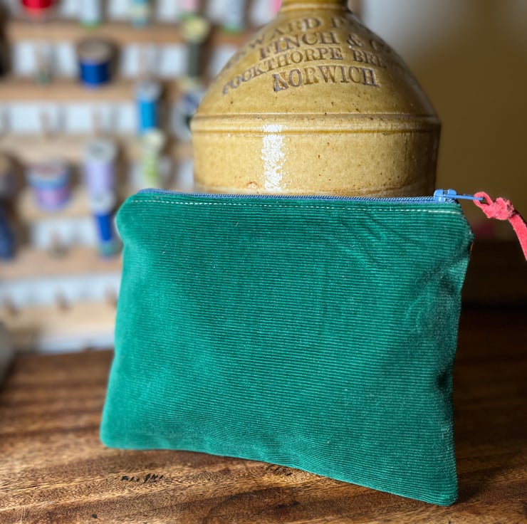 Small zip pouch made from vintage linen with a pretty floral design and dark green needlecord. This handy little bag is fully lined in navy spotted cotton.