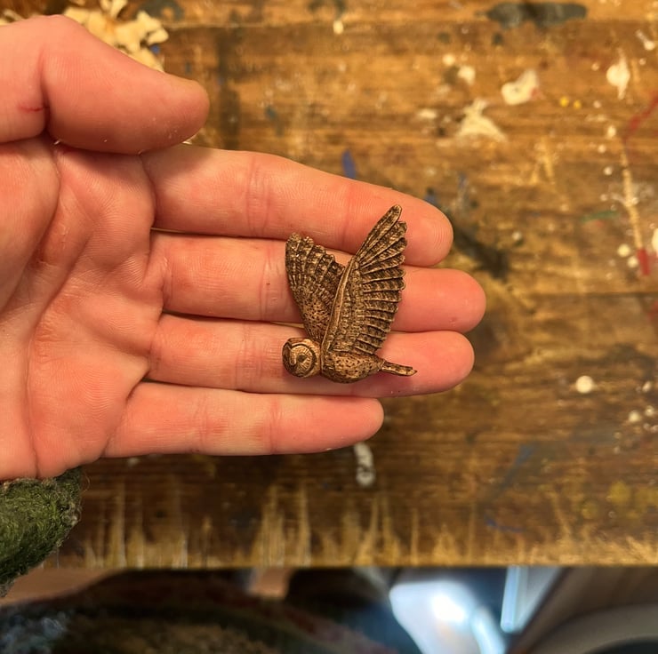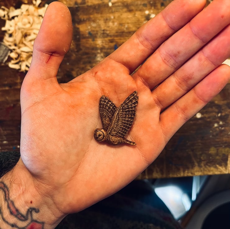 This little barn owl is hand carved from linden wood and finished with a blend of natural waxes and oils. His black feather markings, and his little beaky and blinky eyes have been burned on using a soldering iron.
