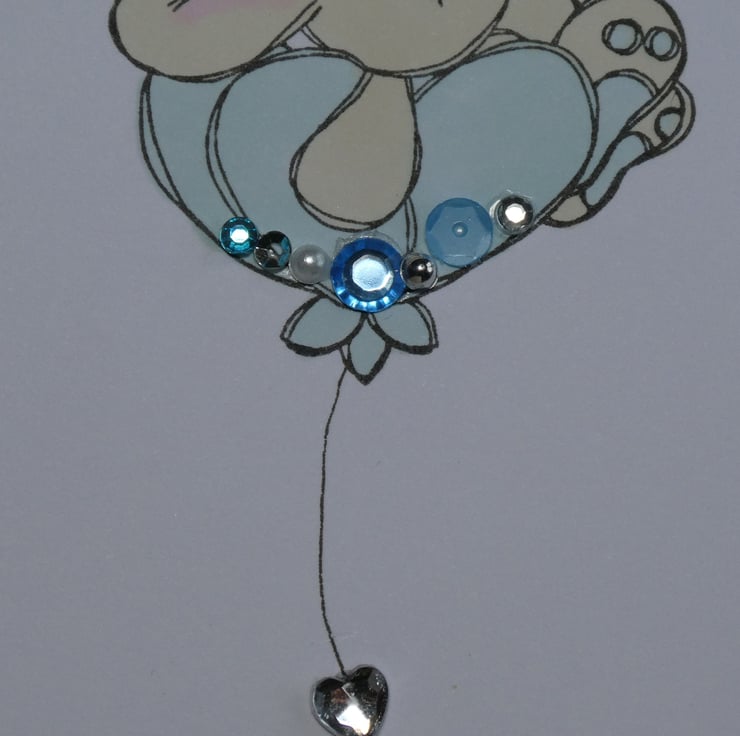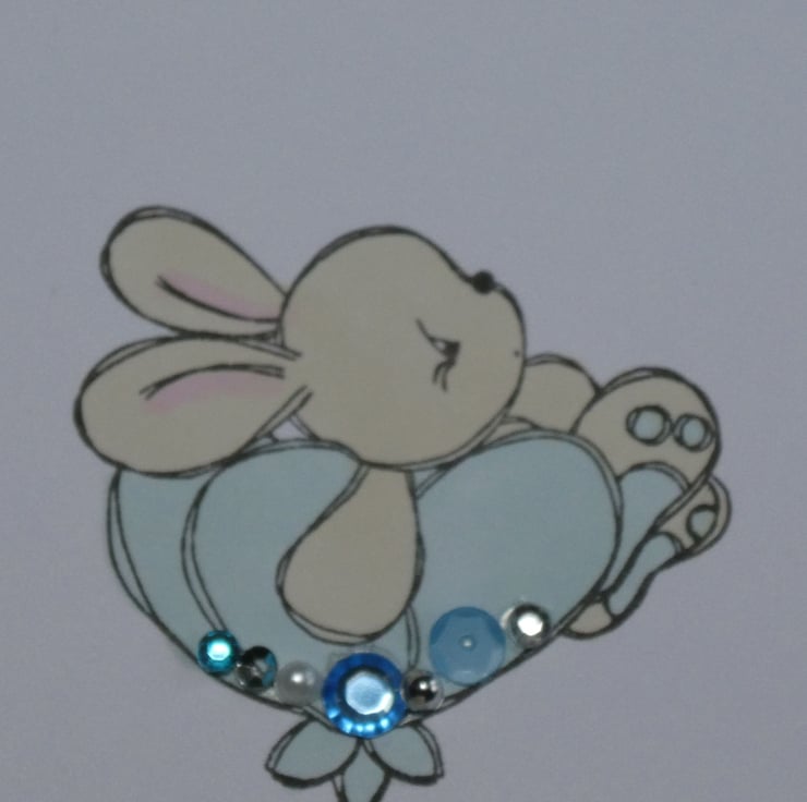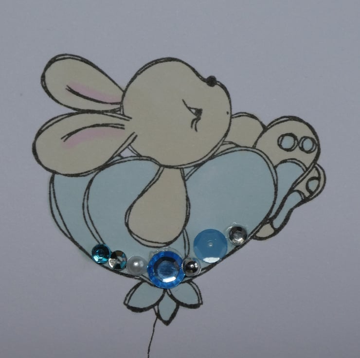 The image of a bunny resting in the petals of a flower has been hand stamped and inked in soft beige and blue. A selection of sequins, faux pearls and faux gemstones in shades of silver, blue and aquamarine have been added at the bottom of the flower and on it's hand drawn stem.
