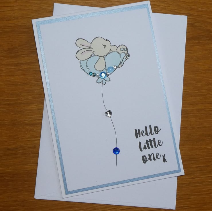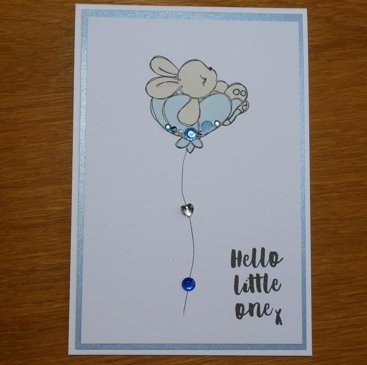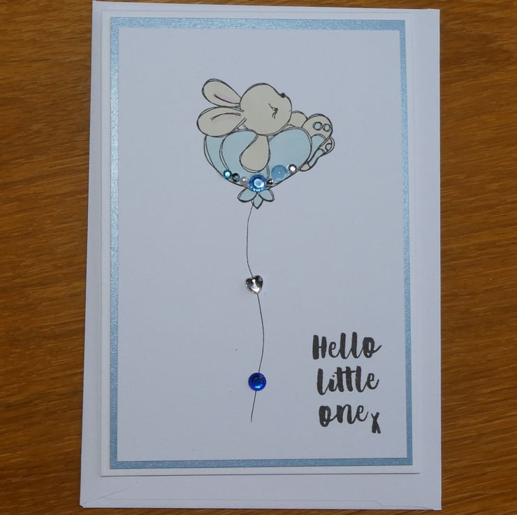 This new baby card has been hand stamped with a cute rabbit lying in a flower. Coloured in soft pastel blue and finished with a mixture of sequins and faux pearls it would be lovely to send congratulations on the birth of a baby boy.