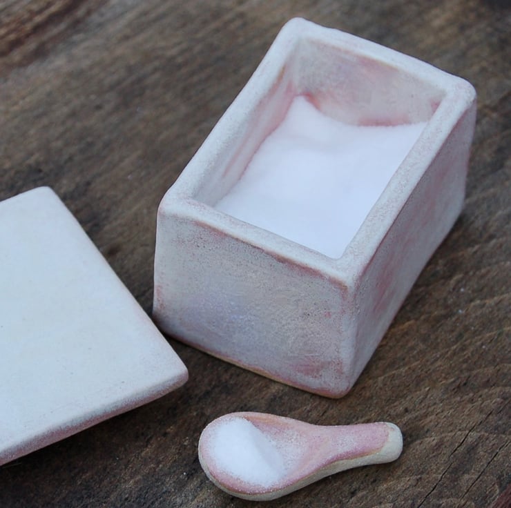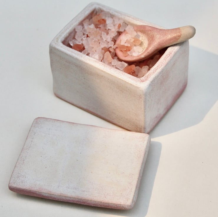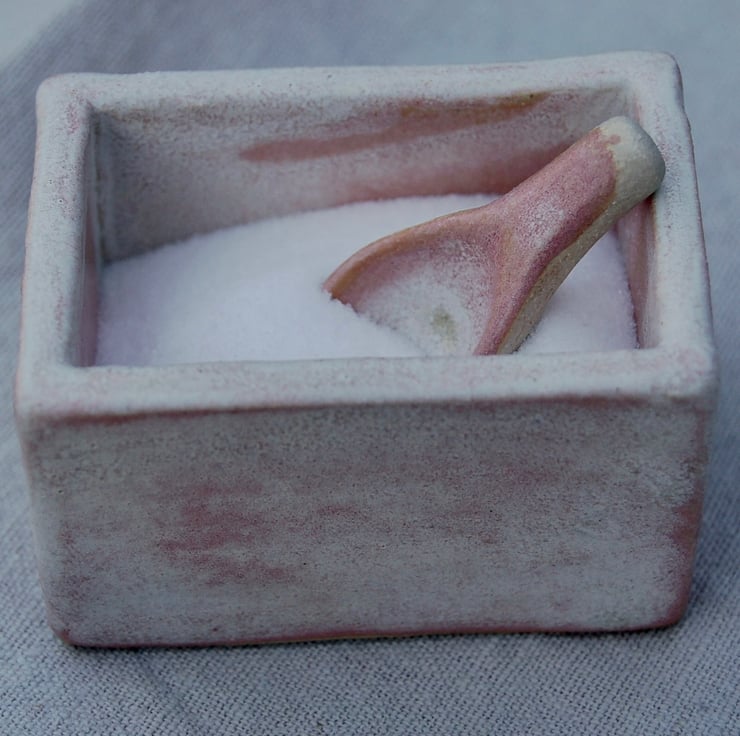 Tiny pink glazed pottery box for table salt. Very neat on a table. The box is slab built and glazed in an artistic matt glaze. Pretty and useful. 6 cm by 5 cm