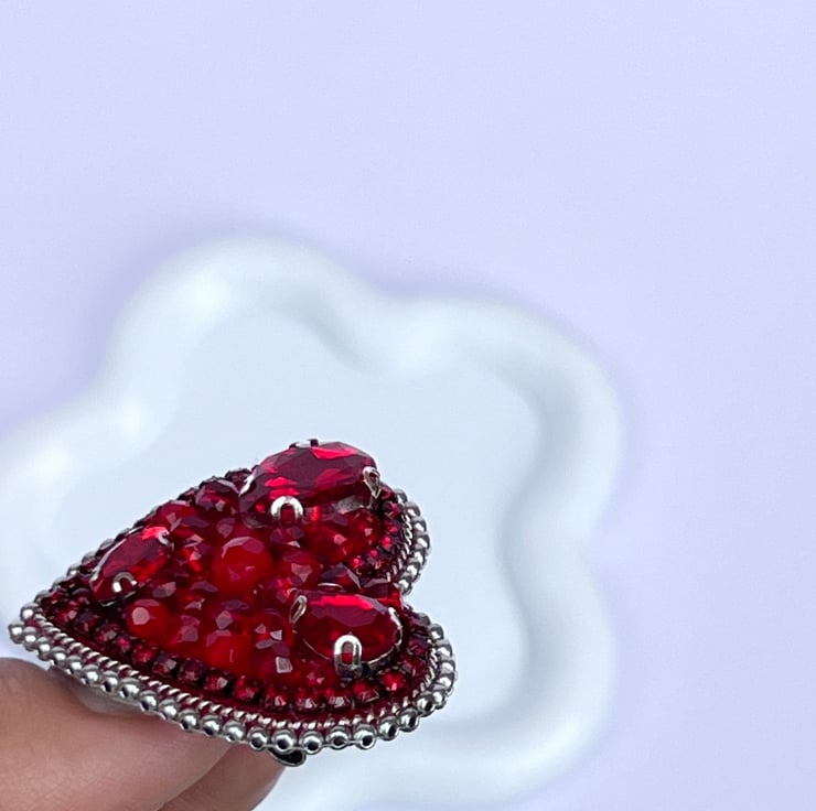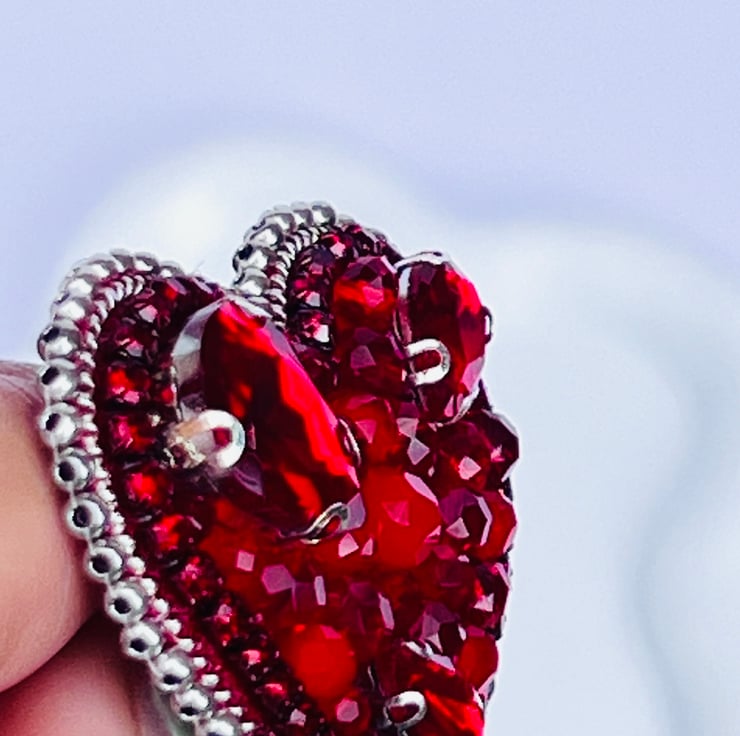 This exquisite handmade red heart brooch is a perfect symbol of love and passion . Vibrant red beads , crystals and intricate detailing , it make a stunning accessory for any outfit , whether for Valentine’s Day , weddings , anniversary , or simply adding a touch of romance to your look , this brooch is a timeless piece. Carefully handcrafted, it’s a unique gift loved ones or a special treat for your self