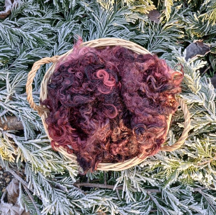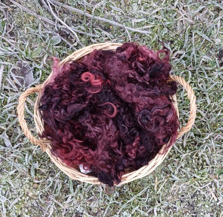 This fleece is from our Autumn shear, it is hand washed. The natural fleece comes in many shades of grey which when overdyed with maroon gives a variety of red and maroon shades. The locks are in soft curls approximately 9cm in length.