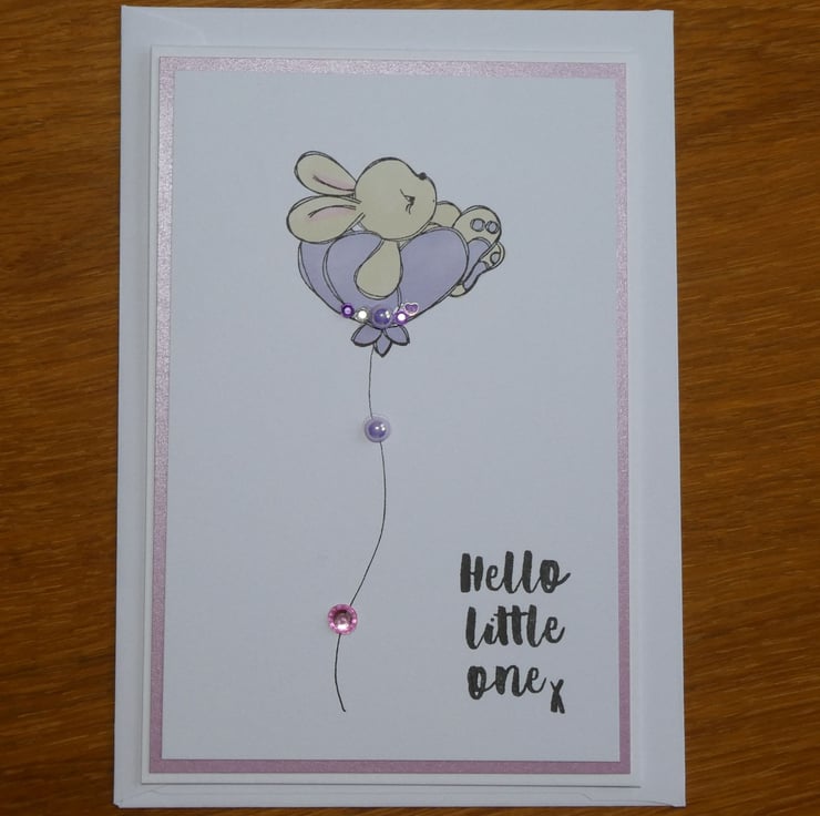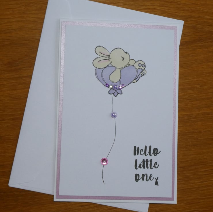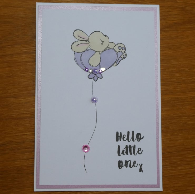 This new baby card has been hand stamped with a cute rabbit lying in a flower.