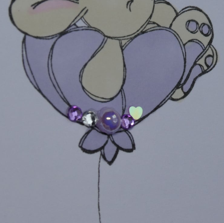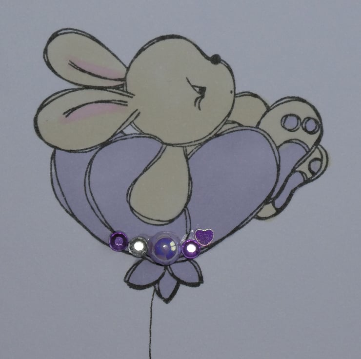 The image of a bunny resting in the petals of a flower has been hand stamped and inked in soft beige, pink and lilac. A selection of sequins, faux pearls and faux gemstones in shades of silver, pink and lilac have been added at the bottom of the flower and on it's hand drawn stem.