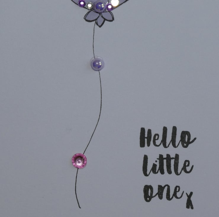 Coloured in soft pastel pink and lilac and finished with a mixture of sequins and faux pearls it would be lovely to send congratulations on the birth of a baby girl.