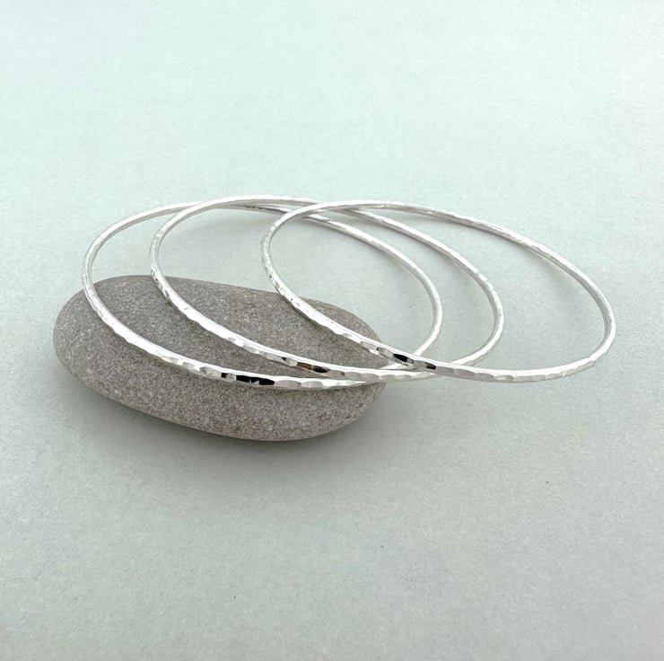These hammered sterling silver bangles are made by myself in my workshop. They are hammered and shaped by hand and are polished to a high shine which catches the light wonderfully when they are worn. They measure c. 2 mm in width and come in three sizes; small (c. 64 mm (6.4cm) diameter), medium (66 mm (6.6cm) diameter) and large (68 mm (6.8cm) diameter). They can be worn individually or stacked to create real impact! This would make a wonderful gift for anyone who loves nature and silver jewellery or even as a little treat for yourself!