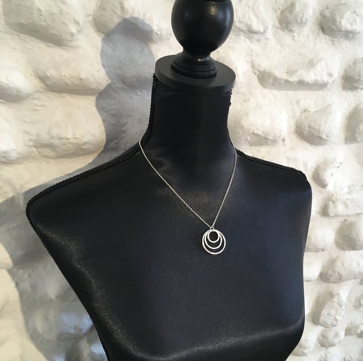 These handmade triple circle pendants, crafted from recycled sterling silver, consist of three graduated hammered circles, the largest around 28mm in diameter, and are suspended on a gorgeous chain. I love the way the light catches the hammered detail of the silver and the way each circle moves independently. This looks great dressed up or down, with a modern feel and minimalist design.