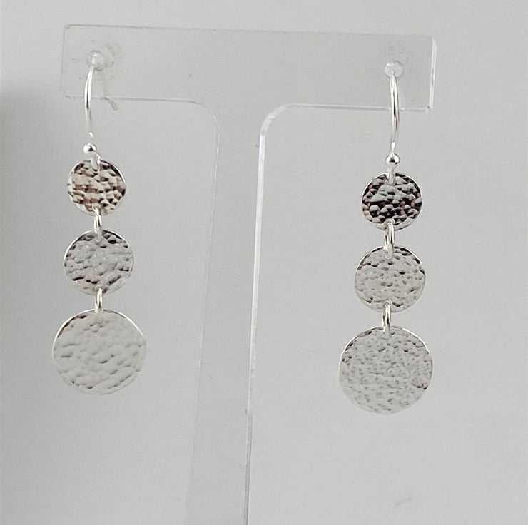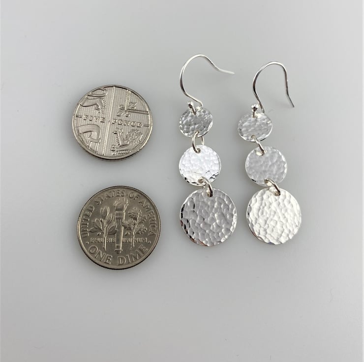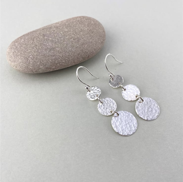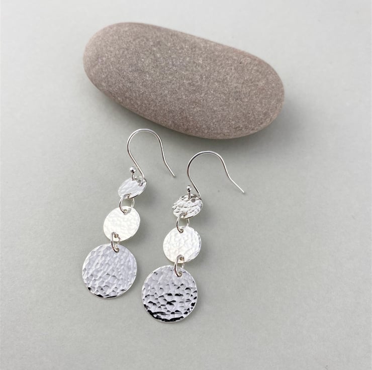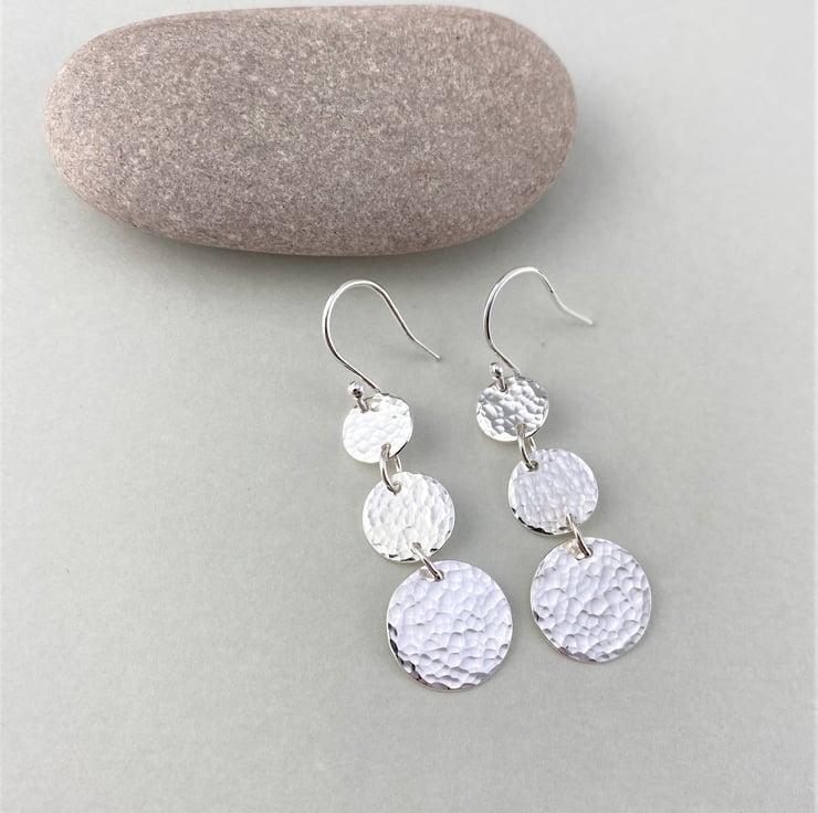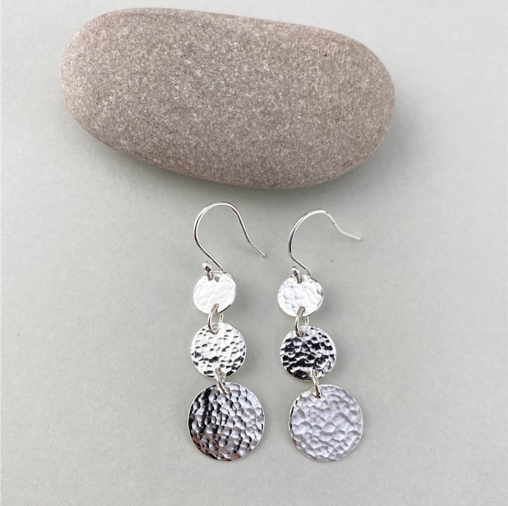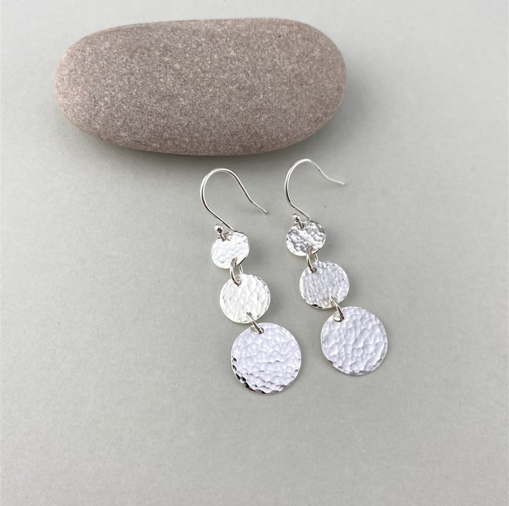 These contemporary disc dangle earrings are made from hammered sterling silver are perfect for everyday wear. Comprised of three graduated silver discs, their modern, minimalist look is subtle yet effective and can be worn by anyone. I love the high polish of the hammered silver surface and the way they glimmer as they are worn. Included with these earrings are an optional pair of clear hypoallergenic ear backs.