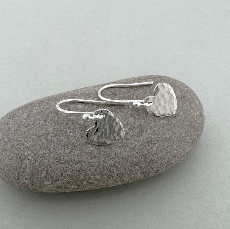 These contemporary heart dangle earrings are made from hammered sterling silver are perfect for everyday wear. Their modern, minimalist look is subtle yet effective and can be worn by anyone. I love the high polish of the hammered silver surface and the way they glimmer as they are worn. Perfect for every day wear!