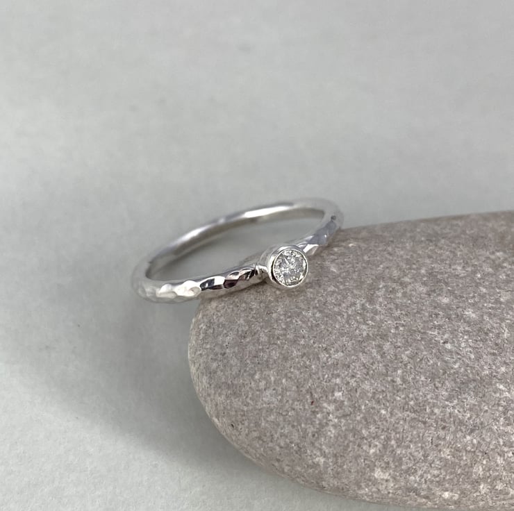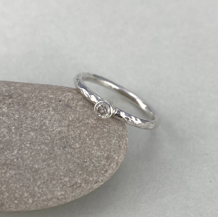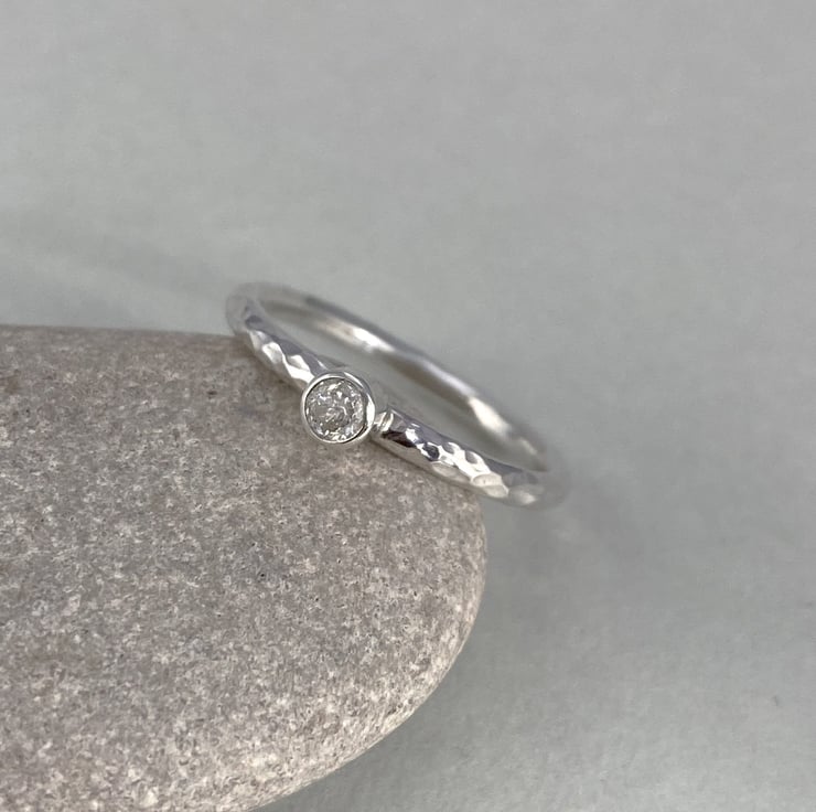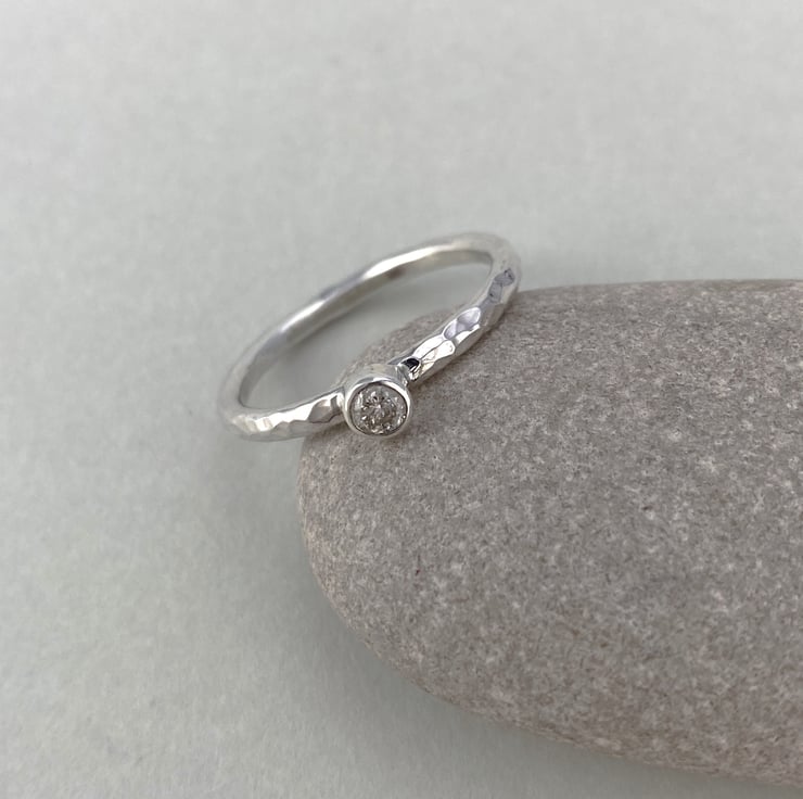 This minimalist and contemporary hammered sterling silver and diamond stacking ring is perfect for a special occasion and ideal for everyday wear. It is available in a UK size P. The ring is comprised of a simple hammered 2mm wide sterling silver band and is set with a sparkling natural brilliant cut diamond, weighing approximately 0.15 carat. The stone has a lovely sparkle and does contain natural inclusions. I love the way the light catches the polished band and the contrasting sparkle and brilliance of the diamond, the birthstone for April. This would make a wonderful gift for anyone who loves craft jewellery or silver, or indeed a little treat for yourself!