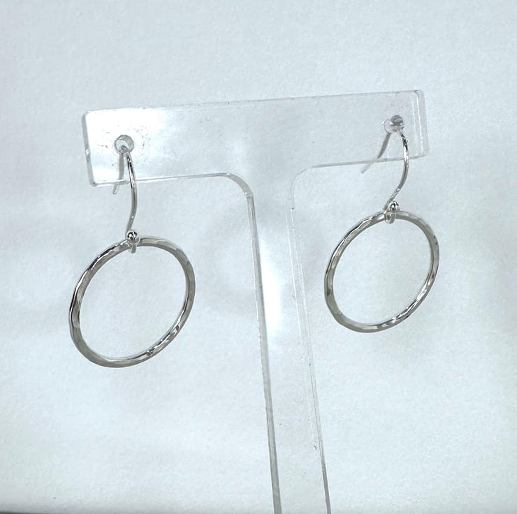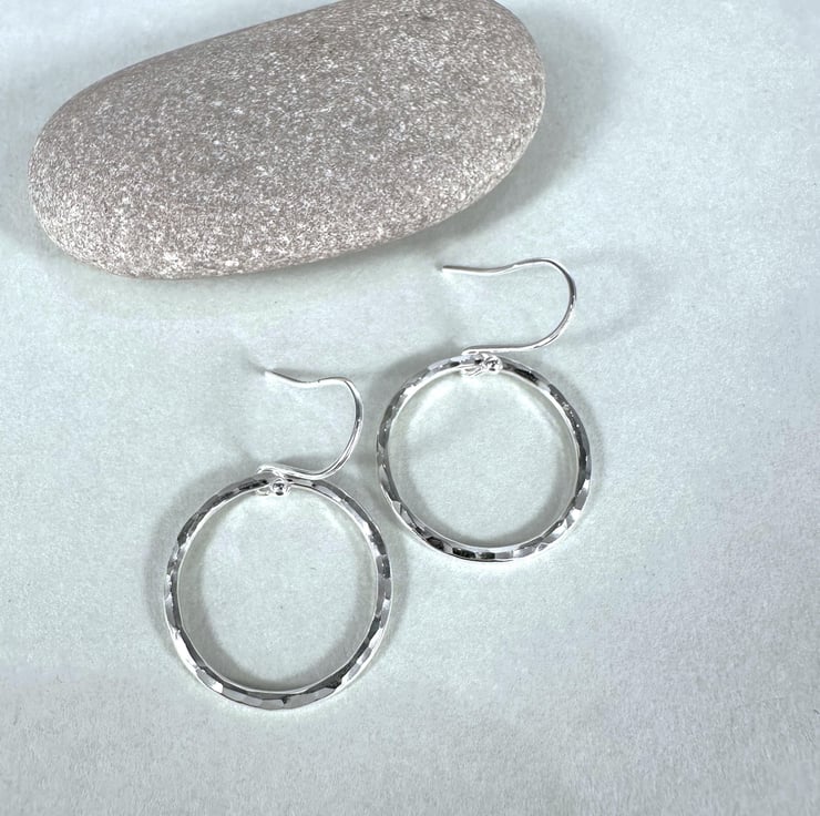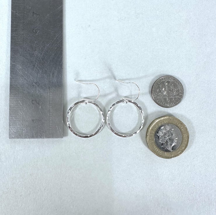 These contemporary circle disc dangle earrings are made from hammered sterling silver are perfect for everyday wear. Comprised of a single hammered circle measuring c. 20mm in diameter, their modern, minimalist look is subtle yet effective and can be worn by anyone. I love the high polish of the hammered silver surface and the way they glimmer as they are worn. Included with these earrings are an optional pair of clear hypoallergenic ear backs.